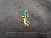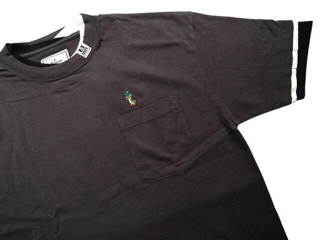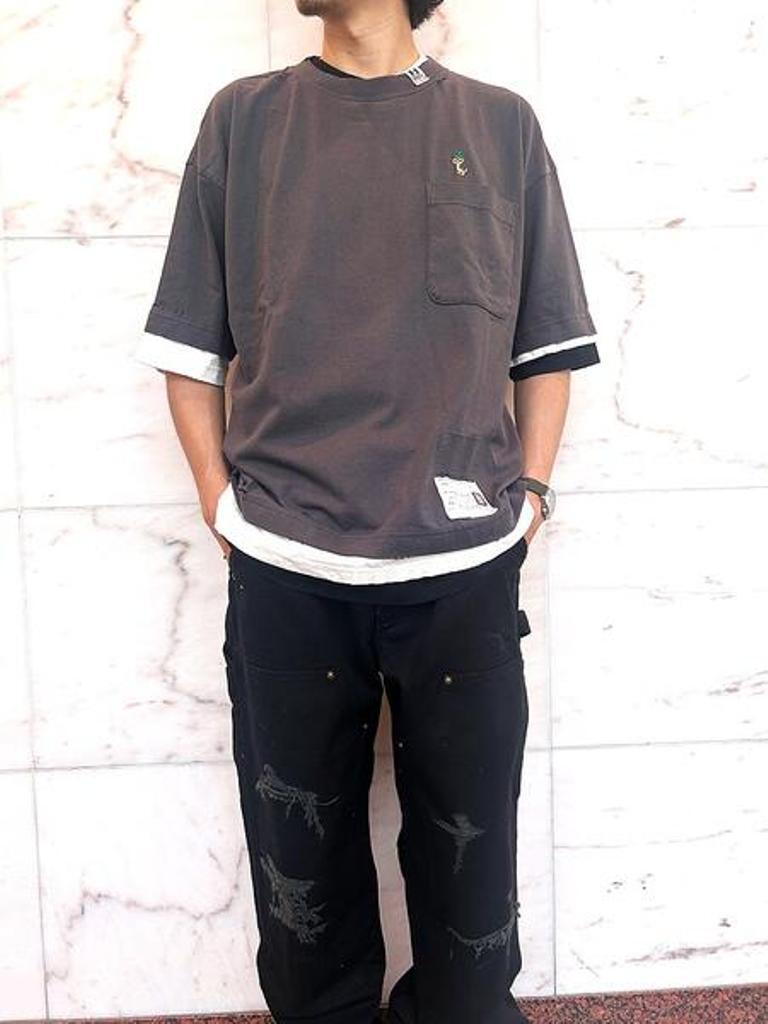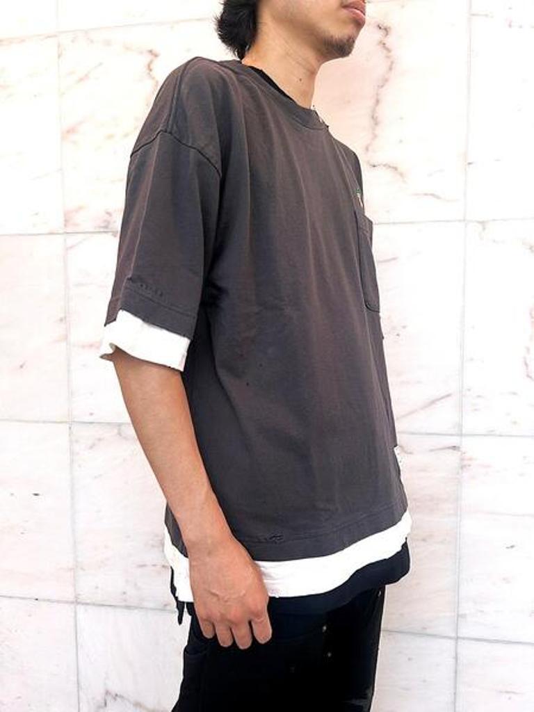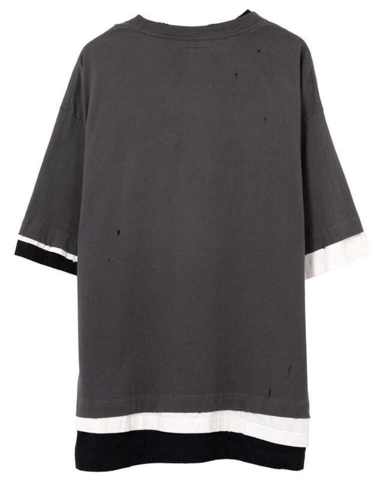 ■異なる色のティーシャツが三層レイヤーされたようなデザインのティーシャツ。全体にダメージ加工、汚し加工が施されています。クルーネック。左胸にレオンの刺繍をデザイン。