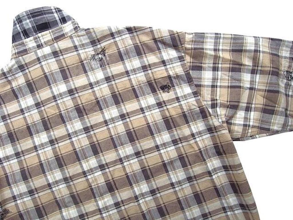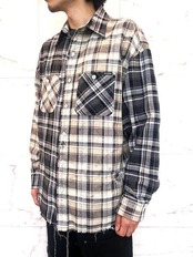 ■コットンフランネル生地のチェックシャツ。ブリーチ加工を施した共地をクレイジーパターンで使用。手作業によるリペア加工を大胆に配置。胸ポケット。