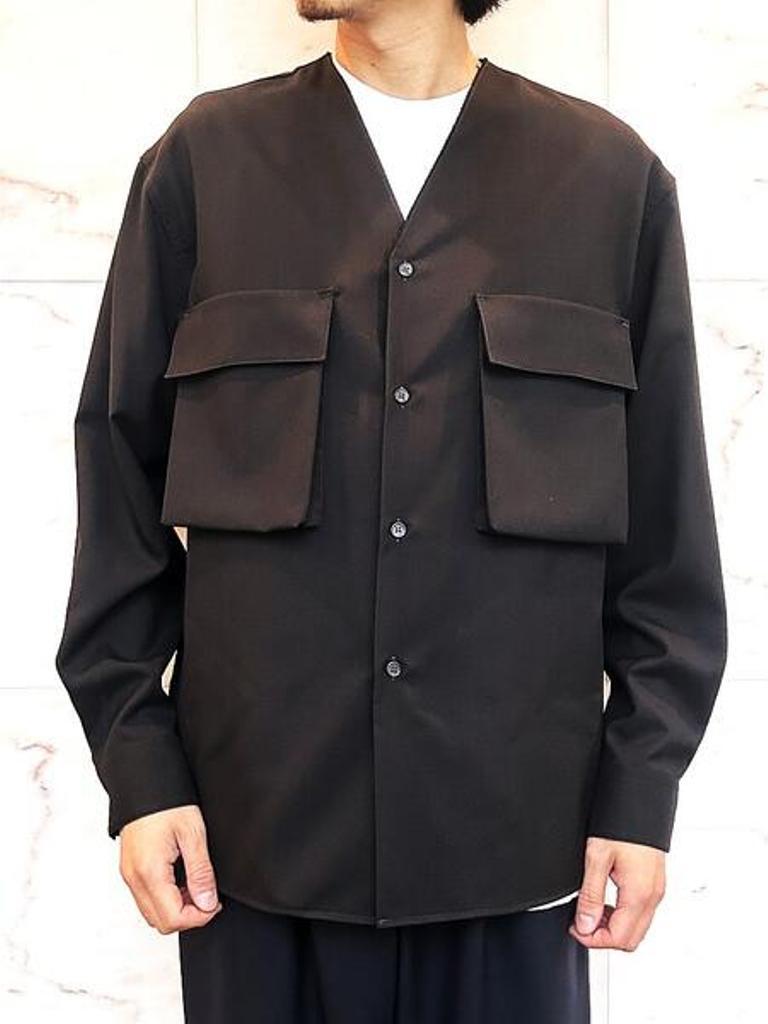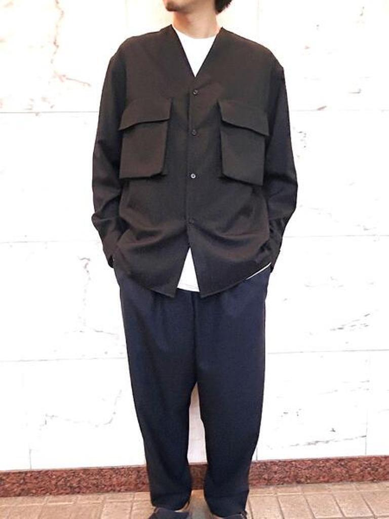 ●マルニ定番人気素材のシーズンレスなトロピカルウールギャバジン使用のノーカラーオーバーシャツ。断ち切り処理のノーカラーに大き目なフラップ付きポケットがアクセント。ゆったりとしたボックスシルエットのリラックスシャツ。