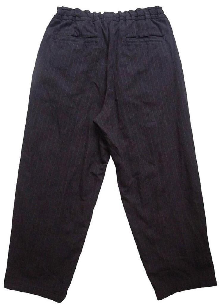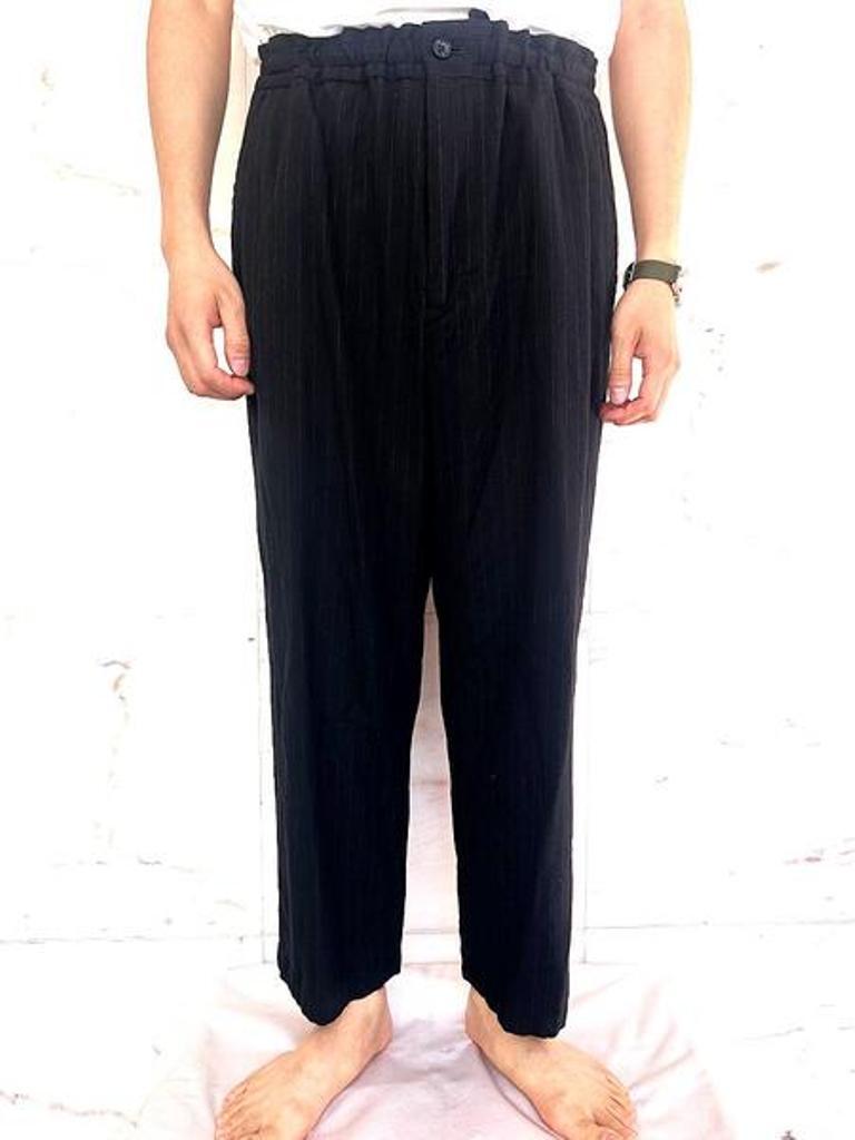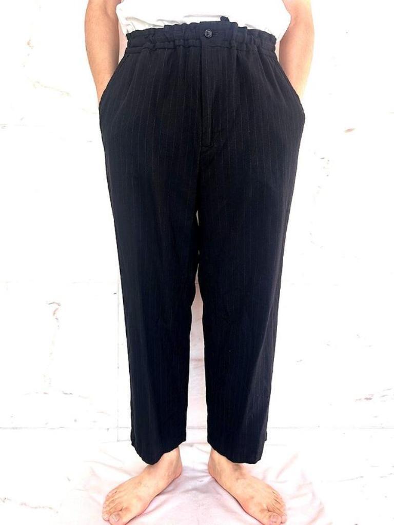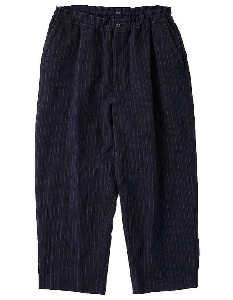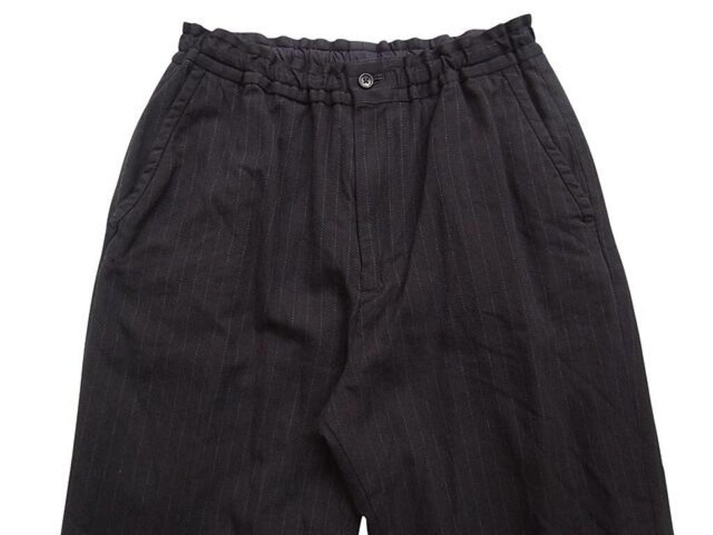 ウールとコットンで織り上げた風合い豊かな生地は、掠れたピンストライプが良い雰囲気です。ゆったりとしていてゆるやかにテーパード、余裕を感じる上品なシルエット。