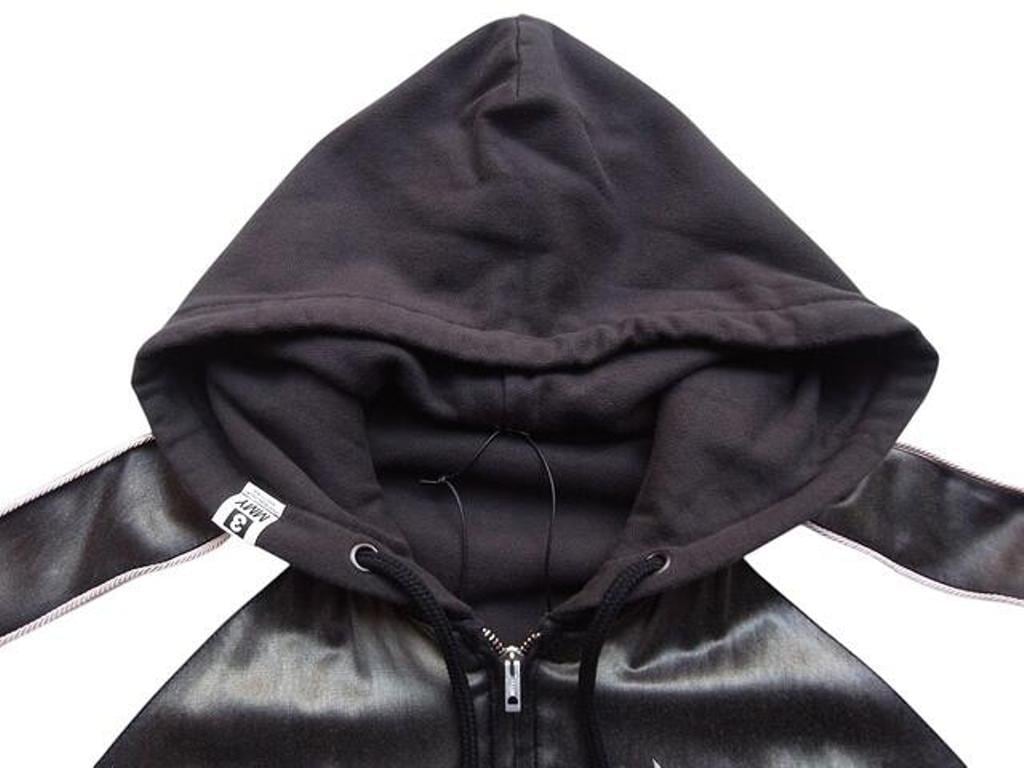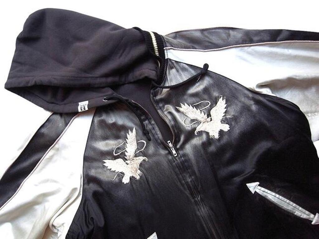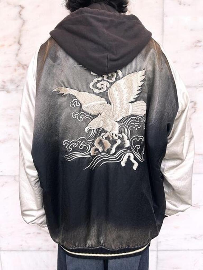●フーディーを重ね着しているように見えるスーベニアジャケット。裏返すと単体のジップフーディーとして着用可能な2Way仕様。刺繍入り。ジップアップ仕様。フロントポケット。ゆとりのあるシルエット。