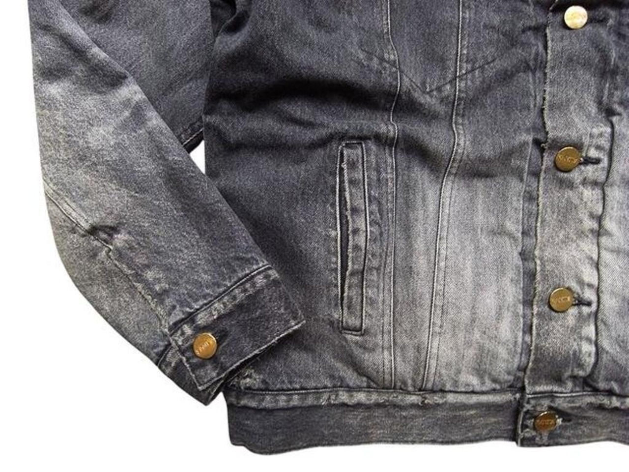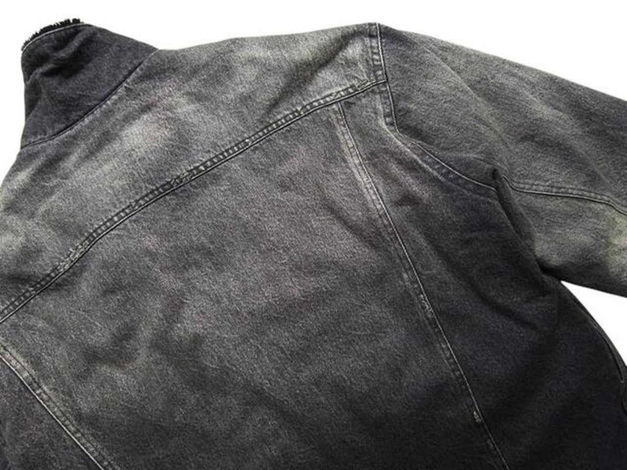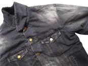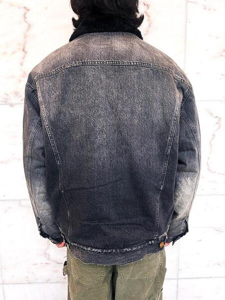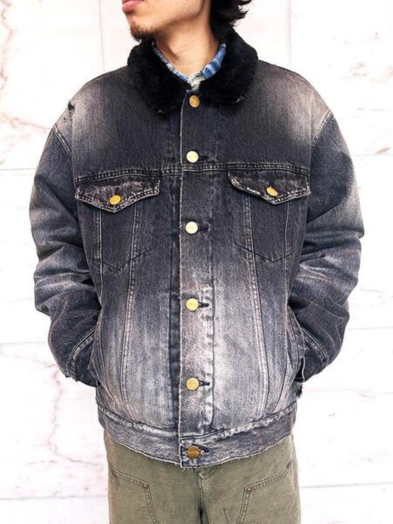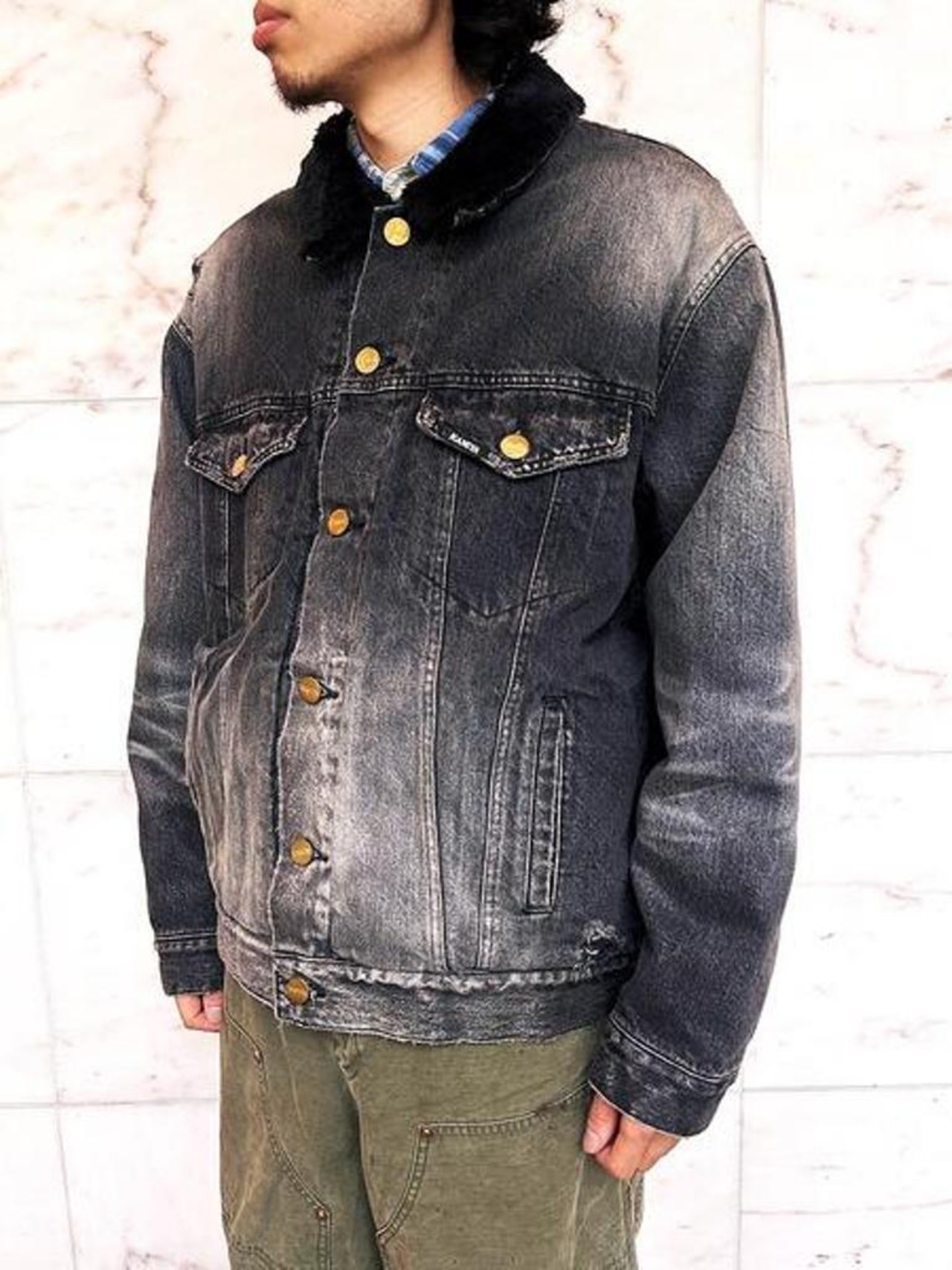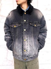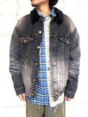 ■13ozブラックデニム生地使用の裏ボアジャケット。毛足の長いボア生地をライニングに使用。長年着用したようなハードなエイジング加工。ワイドフィット。ボタンアップ。胸ポケット。