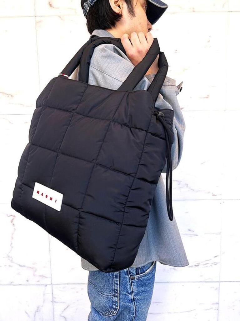 ●トレンドのパフデザインの”マルニ"ロゴパッチブラック"パフ"トートバッグ。スクエアキルティングのソフトパッド入りデザイン。内側にオープンポケット。サイドにトグルストッパー付きドローストリング。ツインハンドル。フロントにラバー製マルニパッチ。ユニセックスアイテムとして特別なギフトやプレゼントとしてもおすすめです!!
