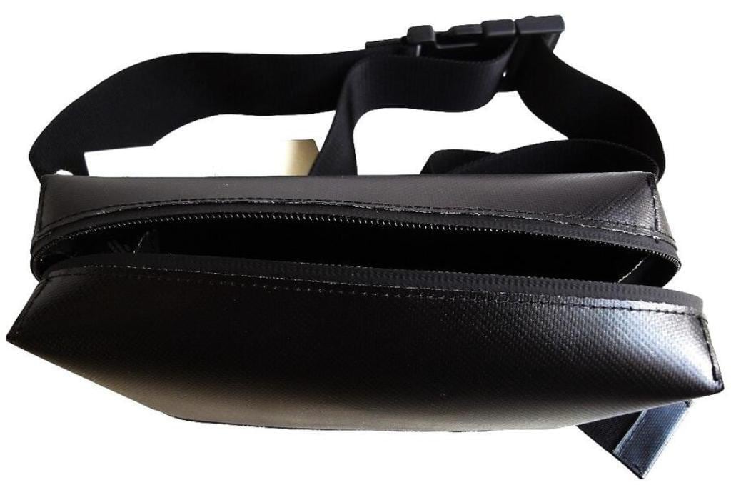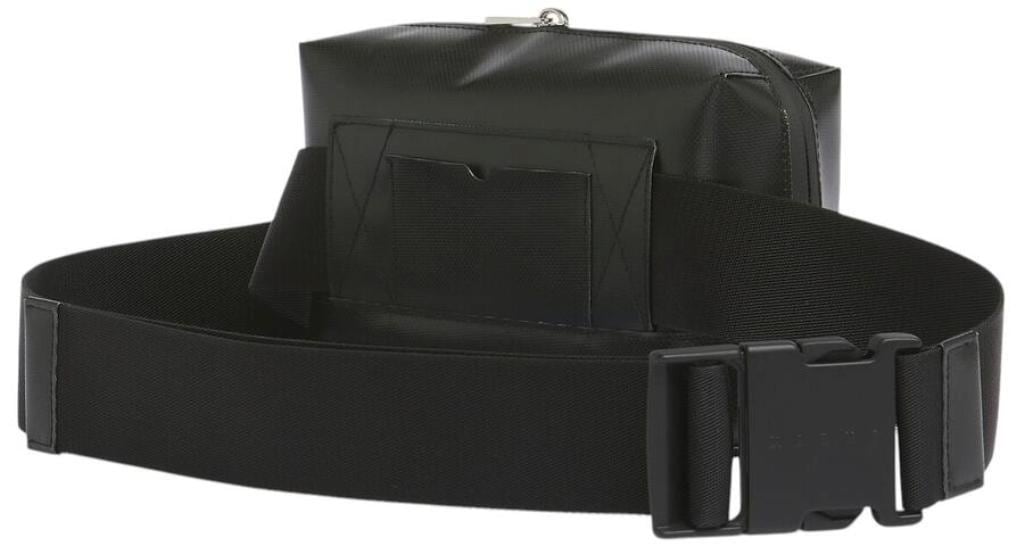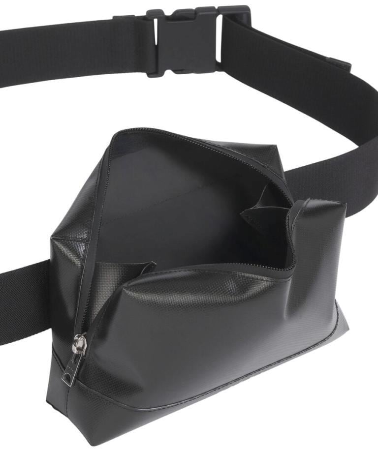 ●マット仕上げのテクニカルファブリック(PVC)を使用したバムバッグ。 調節可能なバックル付きテープベルト。ファスナー開閉、内側にマチ付き。フロントに小さいマルニプリント。