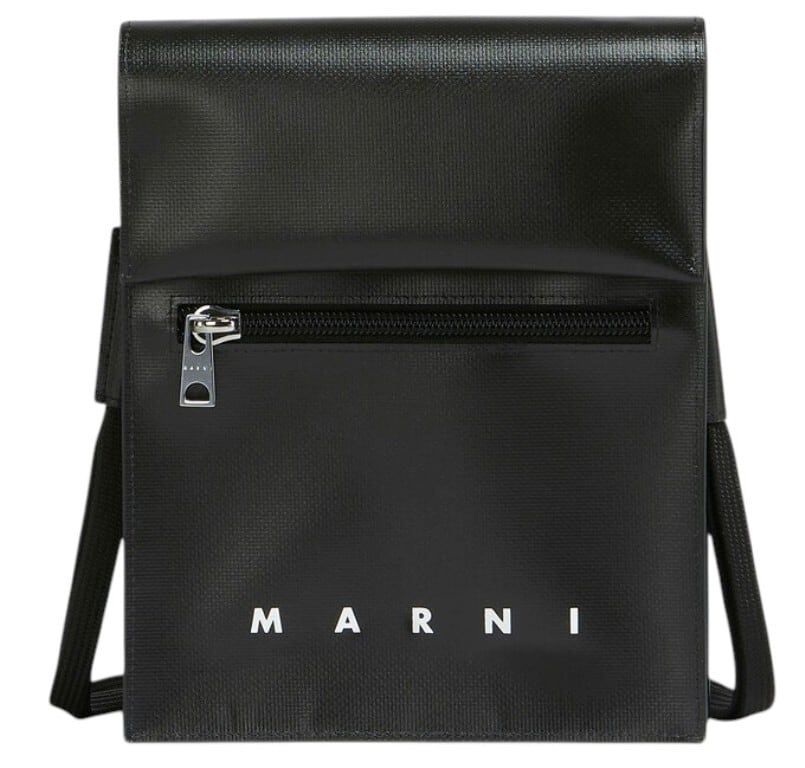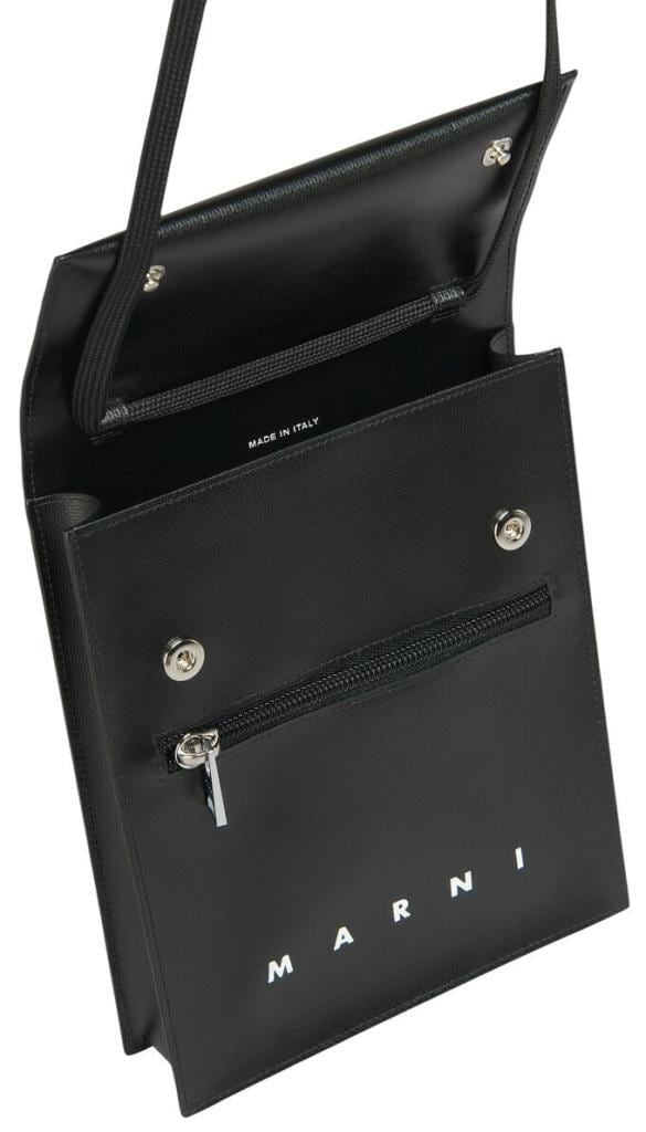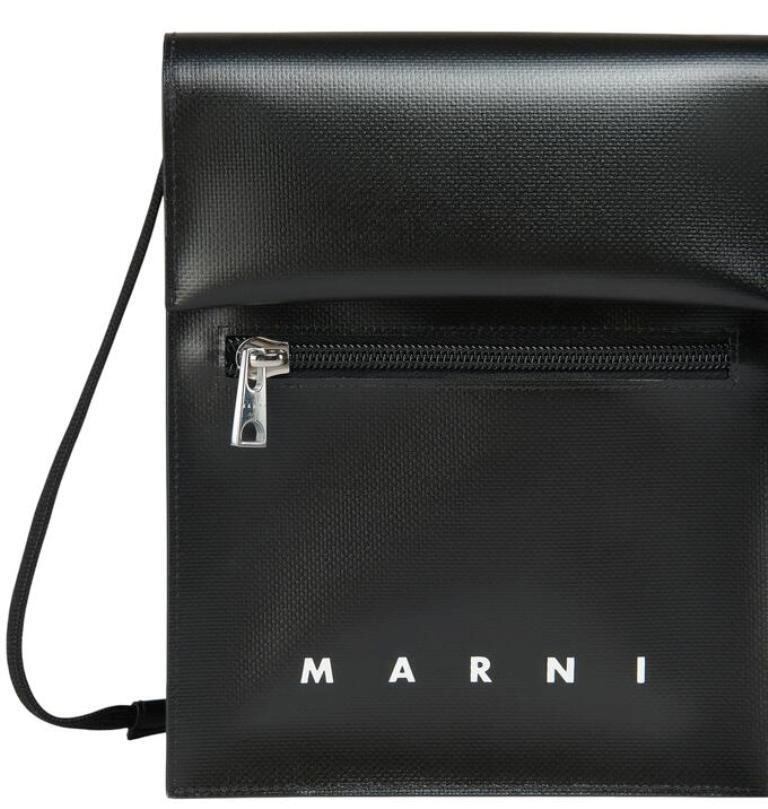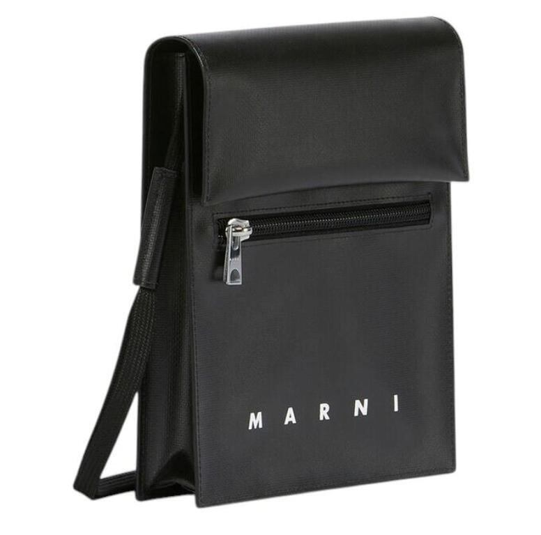 ●マチ付きのポーチ、シューレース調のロングストラップ。ダブルスナップボタンをあしらったフラップクロージャー。フロントにファスナー式ポケット。"MARNI"ロゴのプリント。パラジウム製のメタルパーツ。
