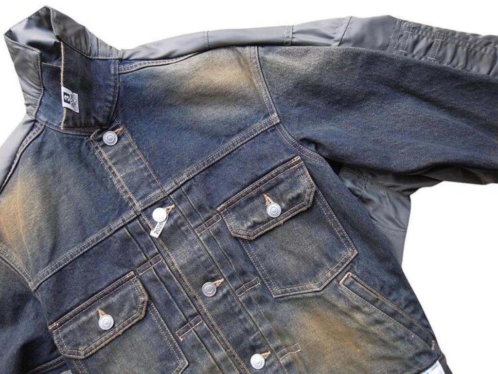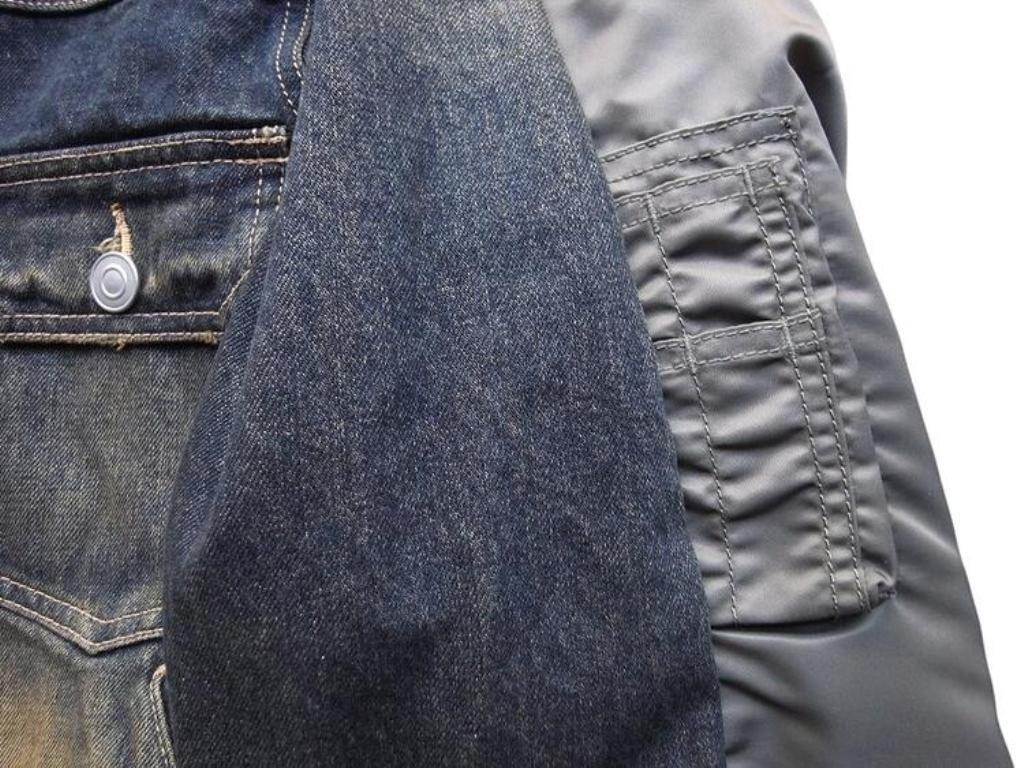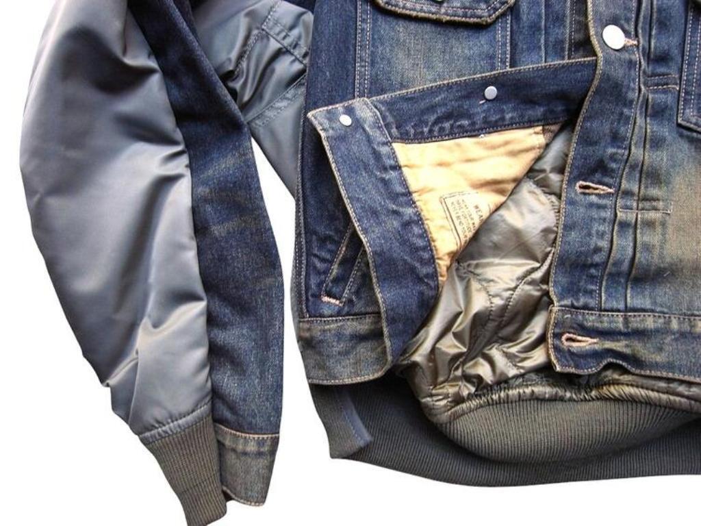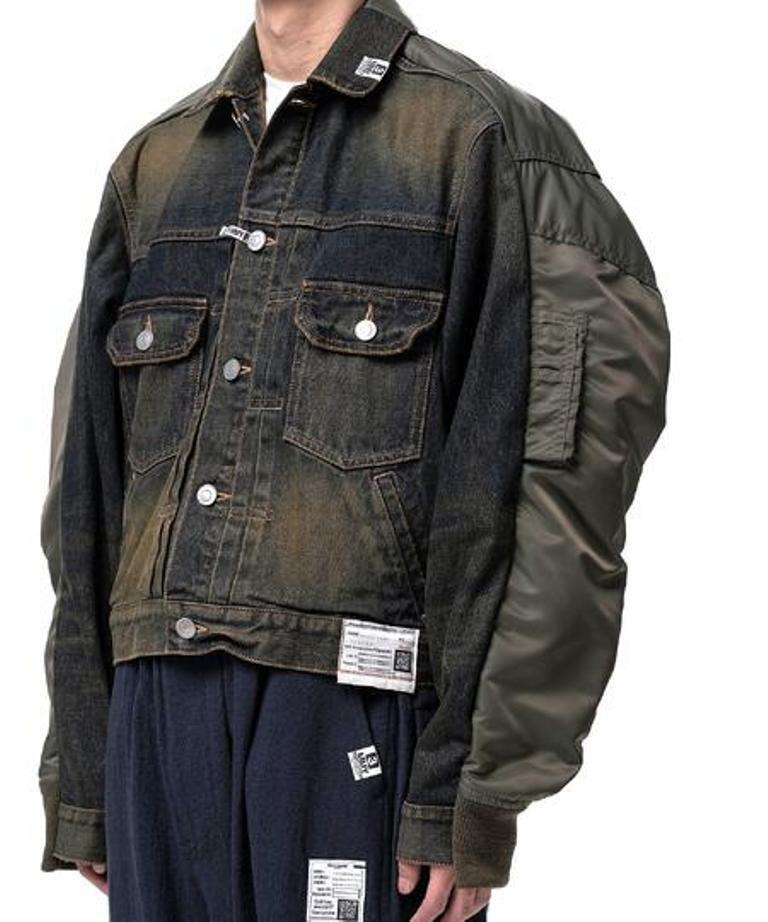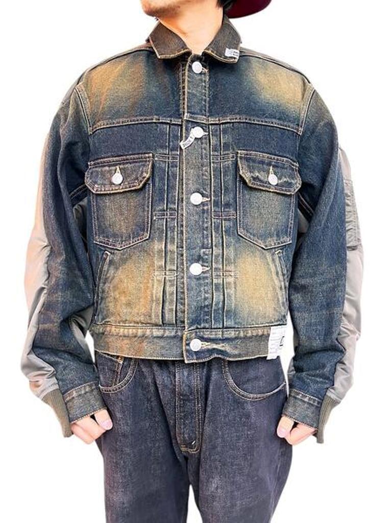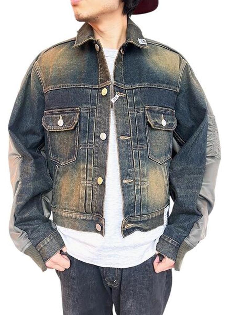 ●デニムとナイロンのコンビ素材のジャケット。デニムジャケットにMA-1がコンバインドされたデザイン。ブリーチ加工を主としたヴィンテージ加工。ボタンアップ。胸、サイドポケット。