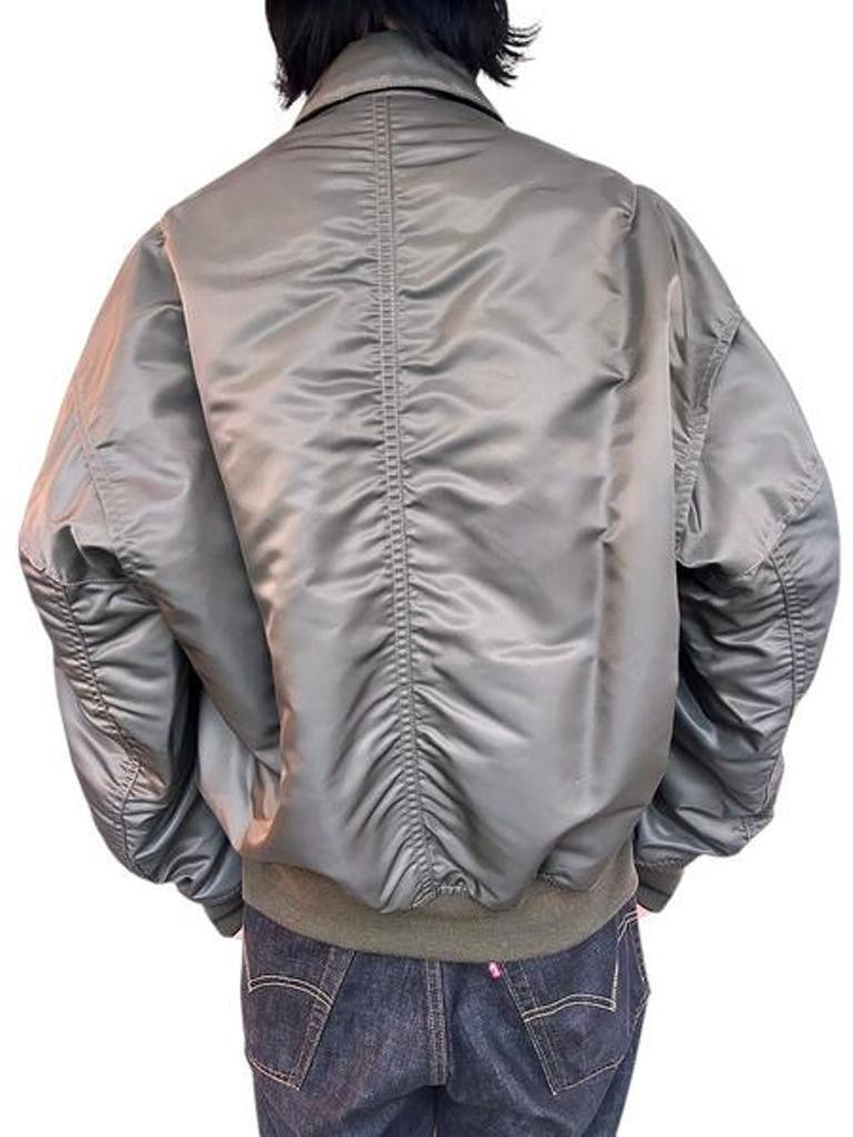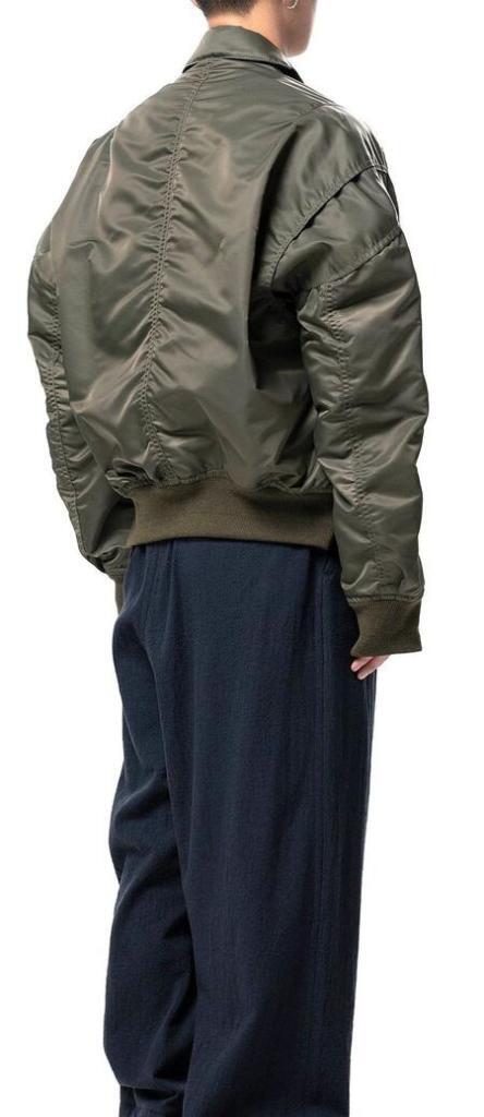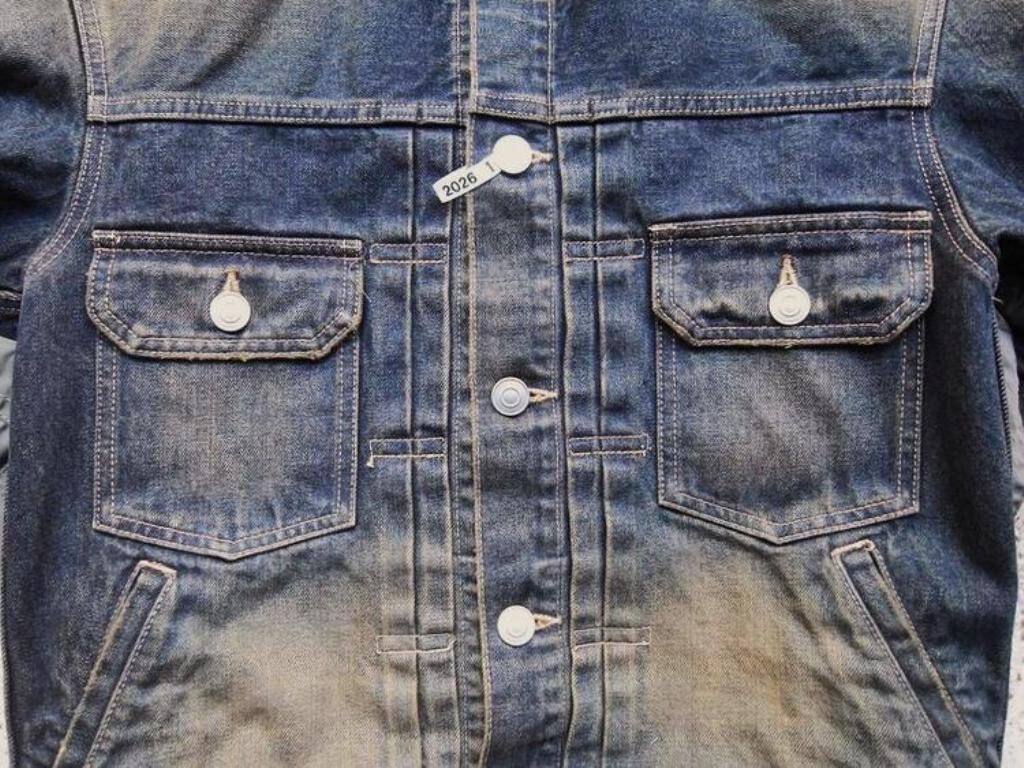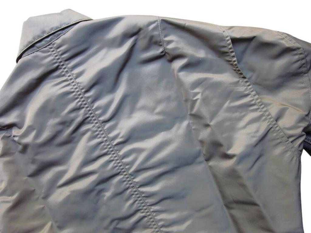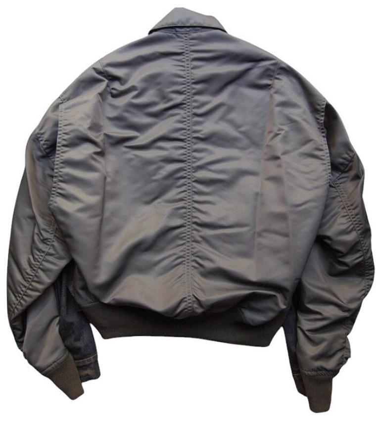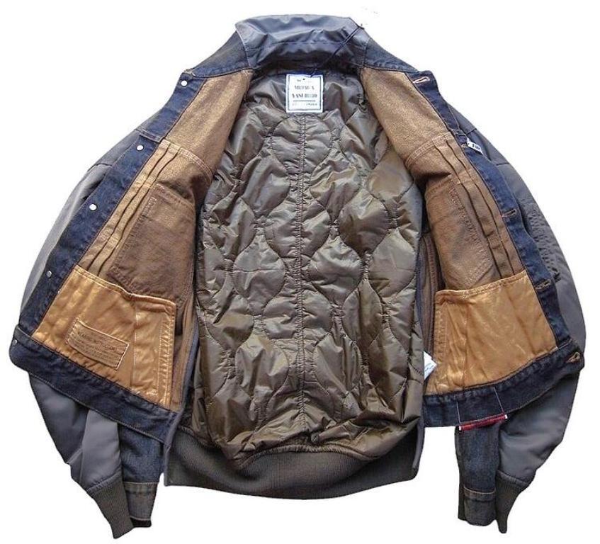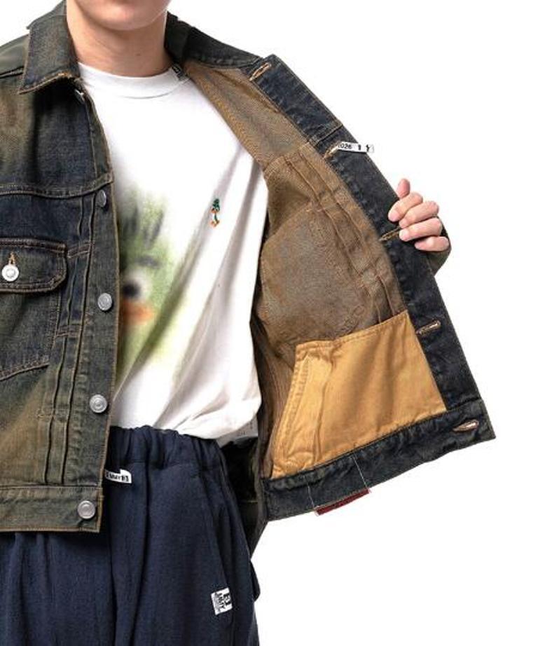●デニムとナイロンのコンビ素材のジャケット。デニムジャケットにMA-1がコンバインドされたデザイン。ブリーチ加工を主としたヴィンテージ加工。ボタンアップ。胸、サイドポケット。