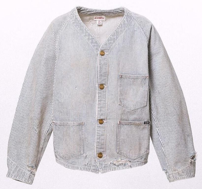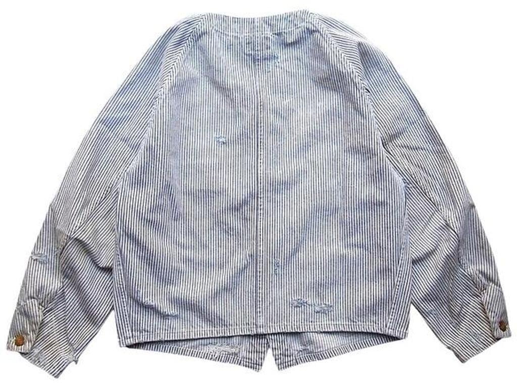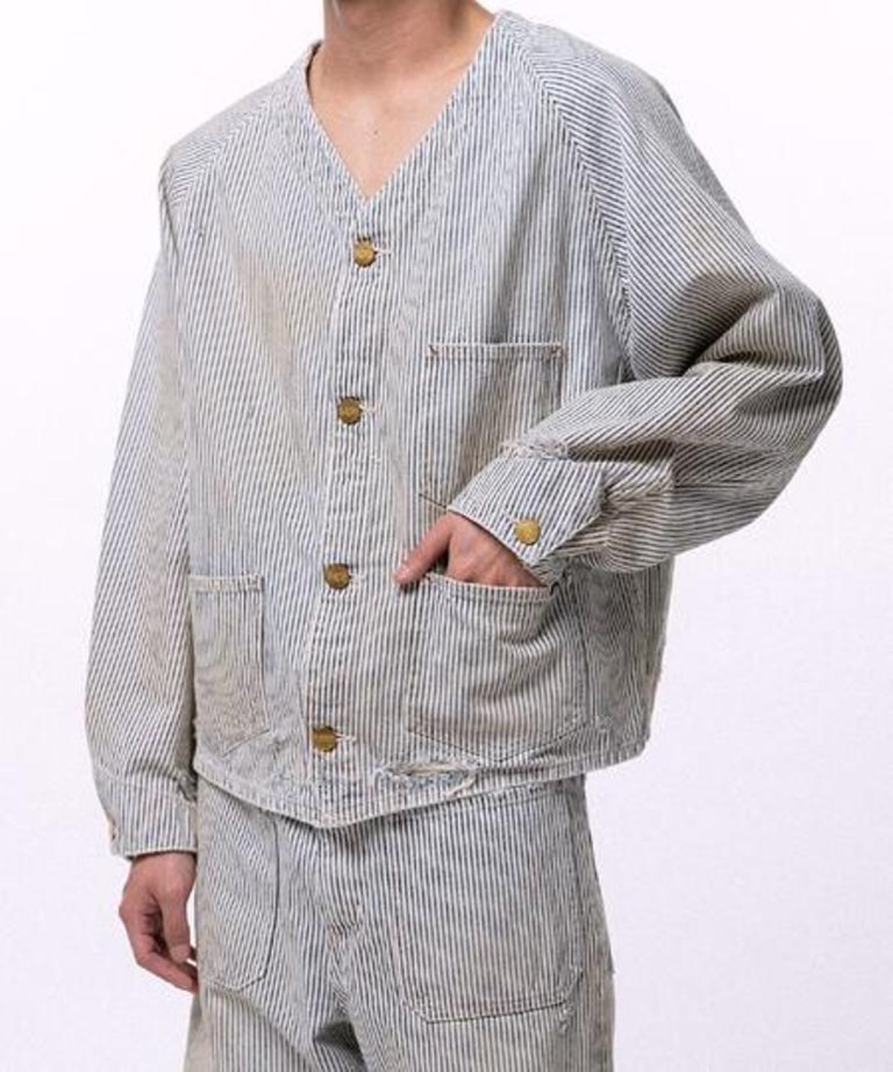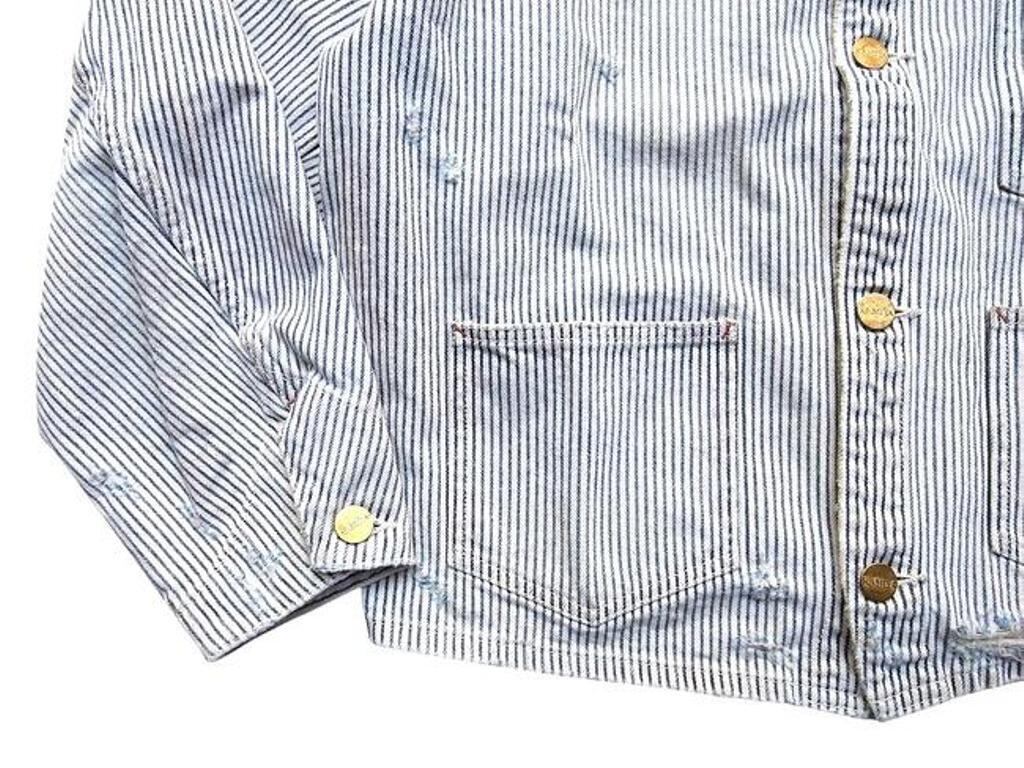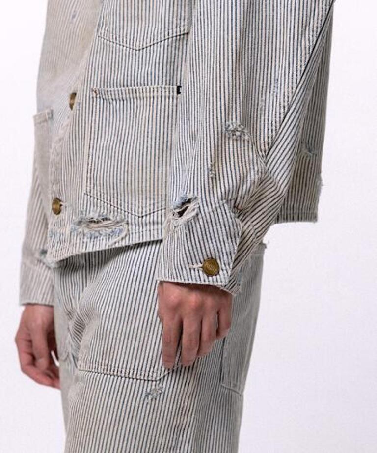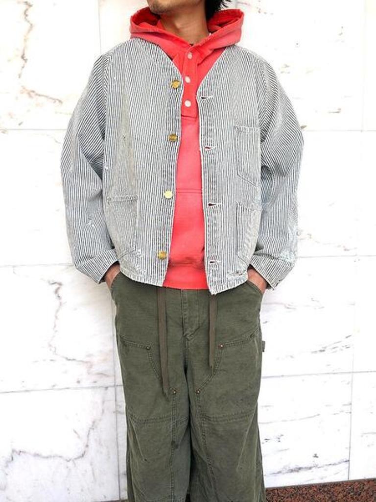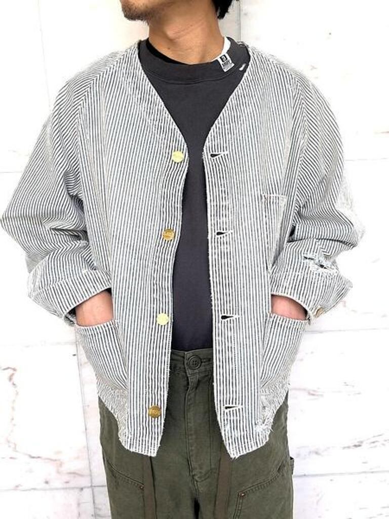 ■12ozヒッコリー生地を使用したワークジャケット。時間の経過を感じさせる強いエイジング加工。ボタンアップ。フロントポケット。レギュラーシルエット。