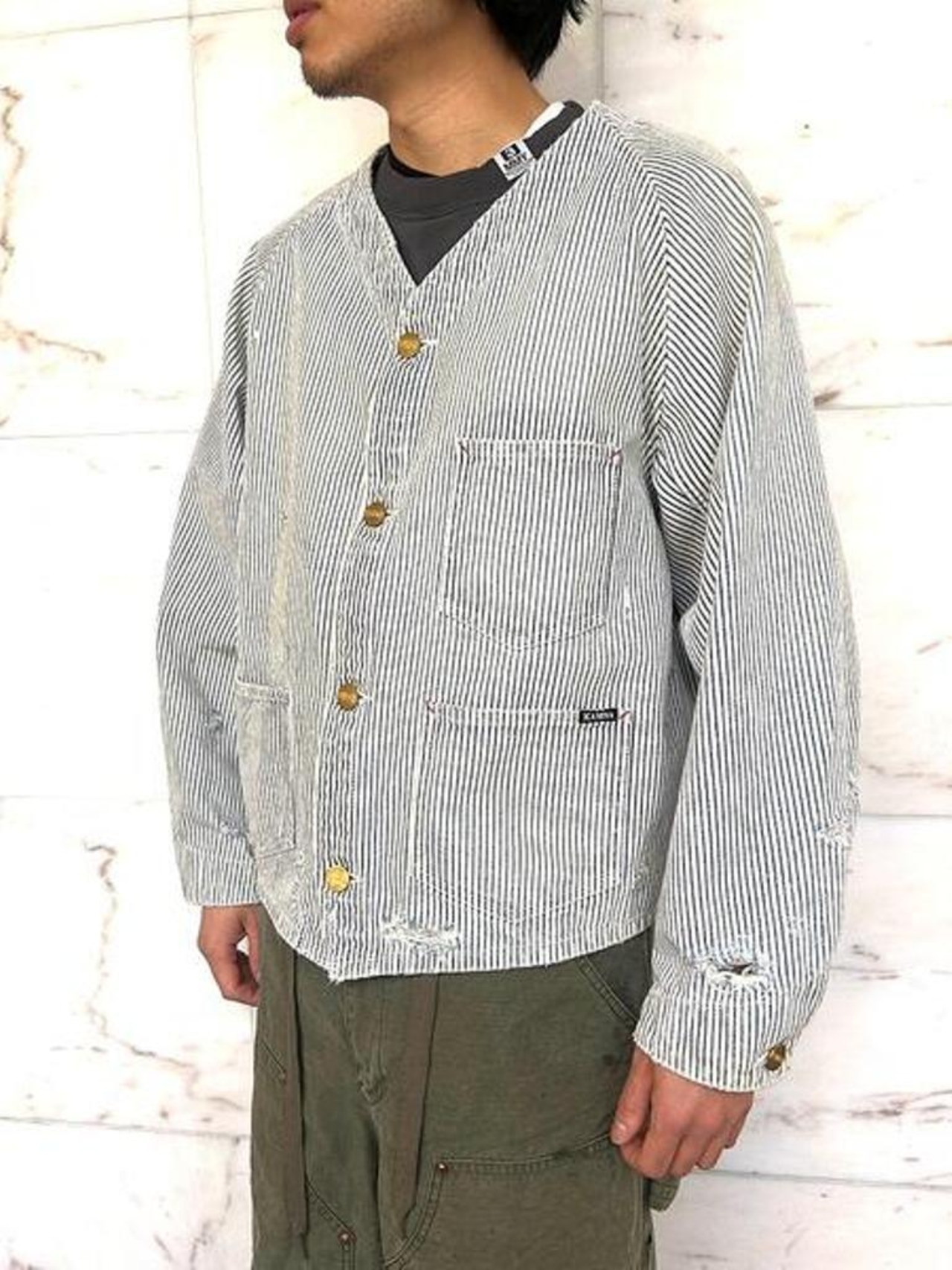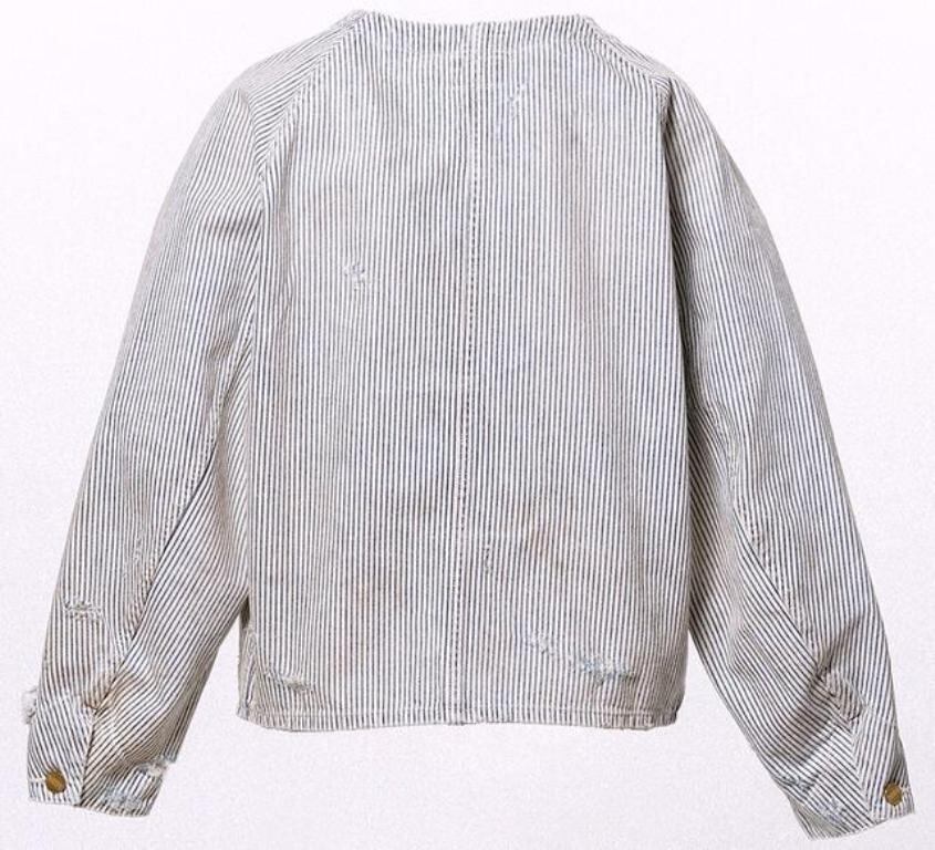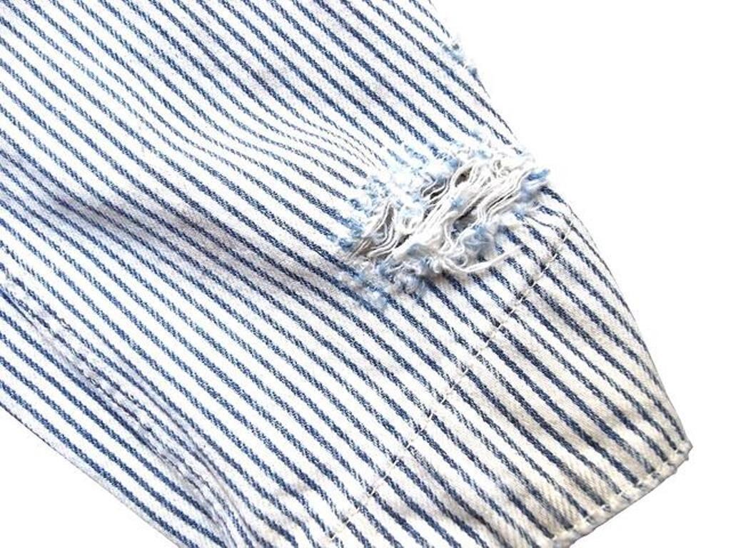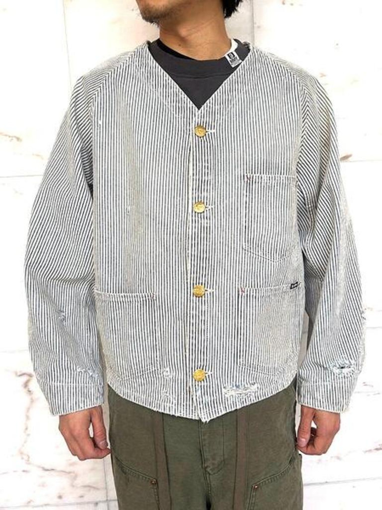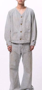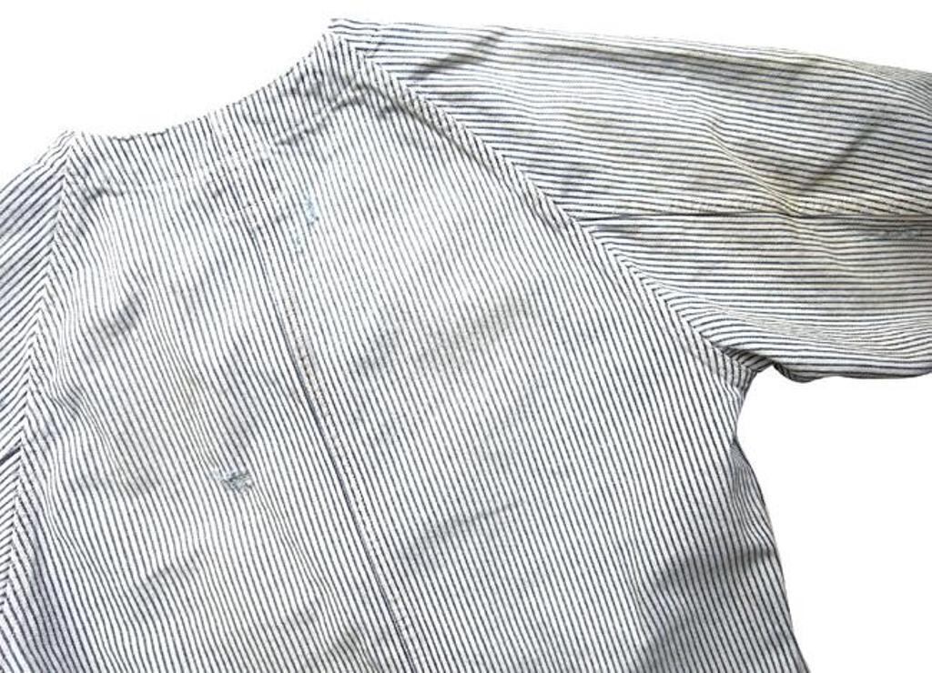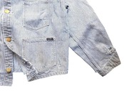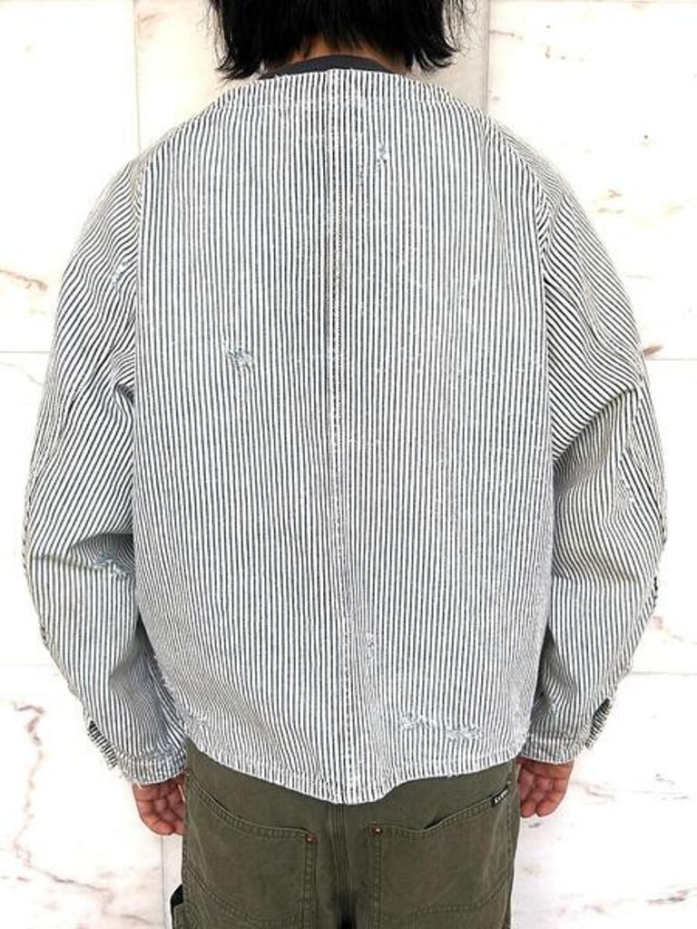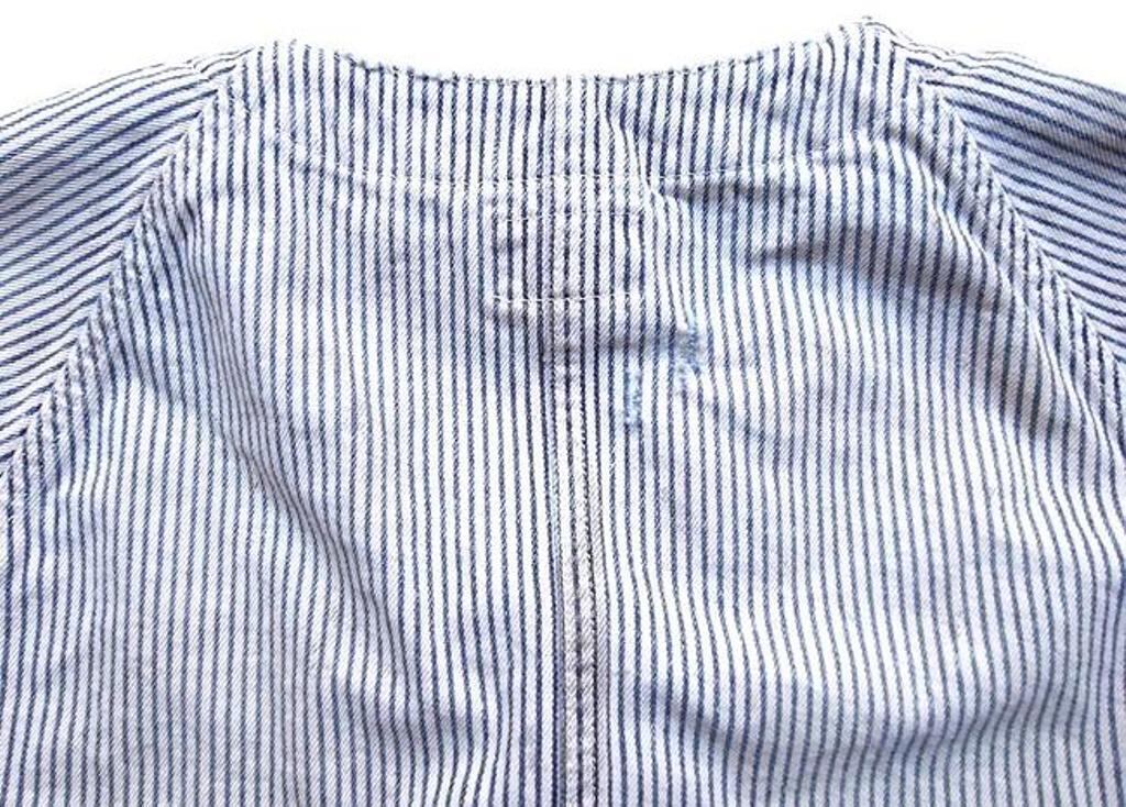 ■12ozヒッコリー生地を使用したワークジャケット。時間の経過を感じさせる強いエイジング加工。ボタンアップ。フロントポケット。レギュラーシルエット。