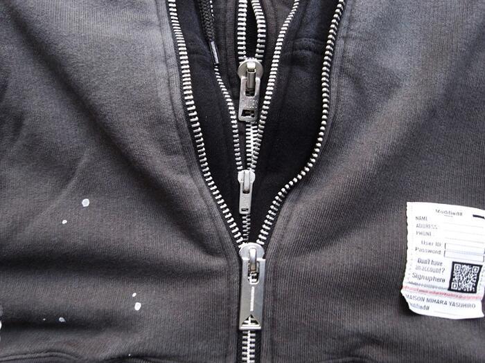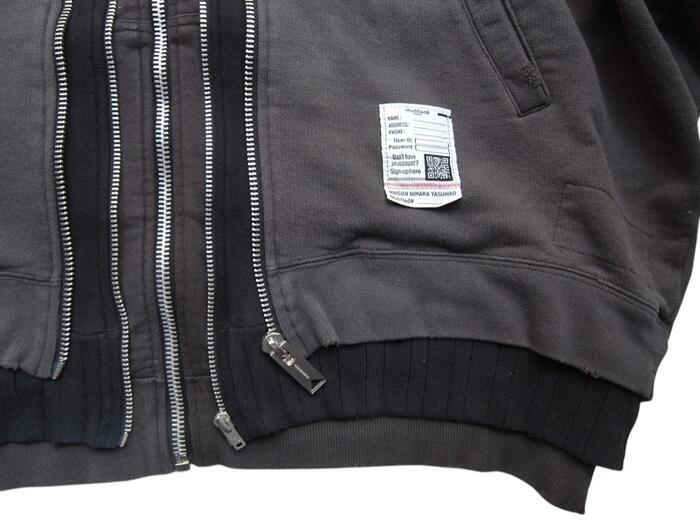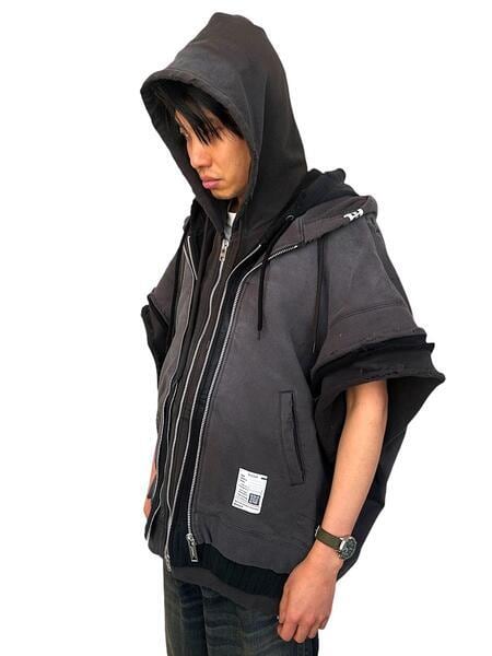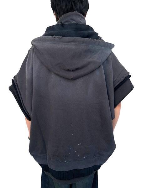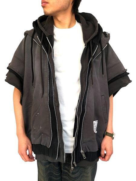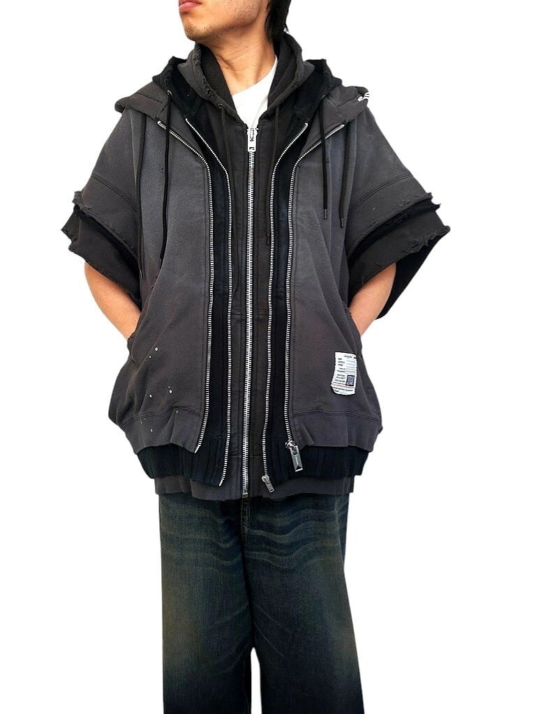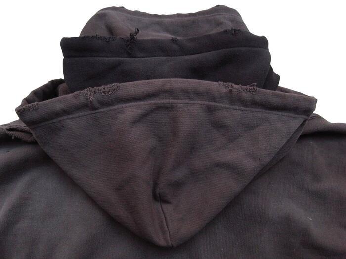 ●グラデーションのようにカラーの異なる3種類のスウエットパーカーをレイヤードした”トリプルレイヤードノースリーブジップアップパーカー”。袖、カットオフのノースリーブ仕様。ゆったりとしたワイドシルエットで一枚着としてはもちろんカットソーやタンクトップ、シャツなど多様なトップスを合わせて着用可能なシーズンレスなアイテムです。