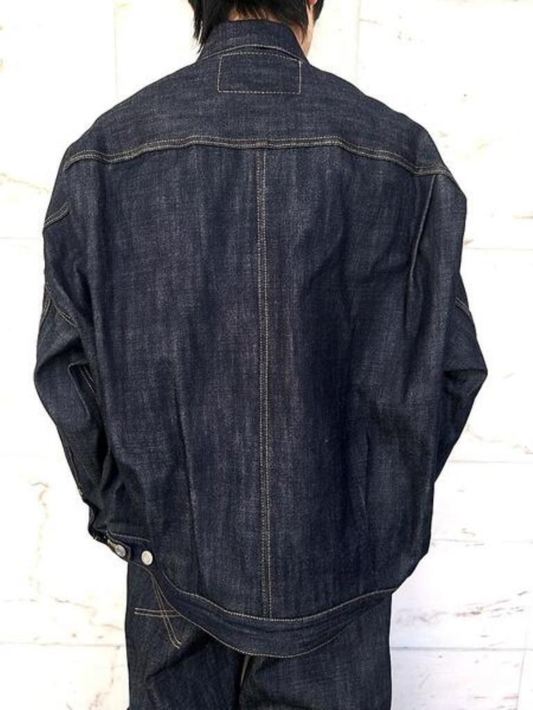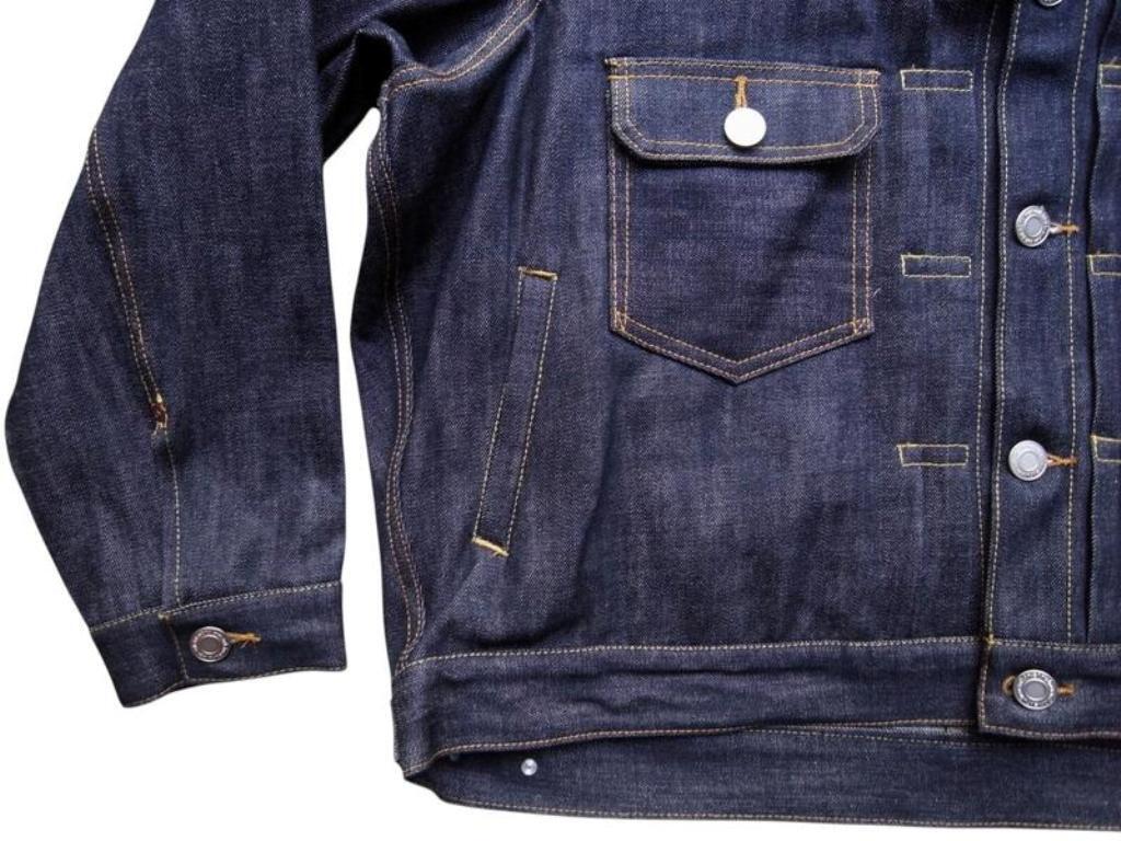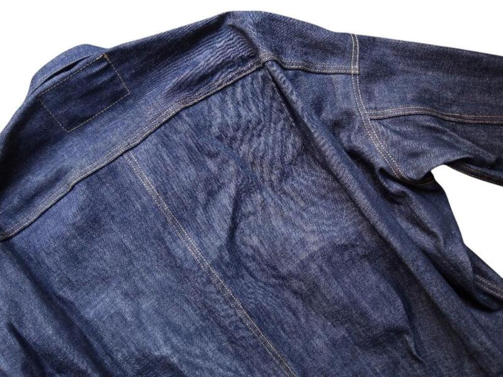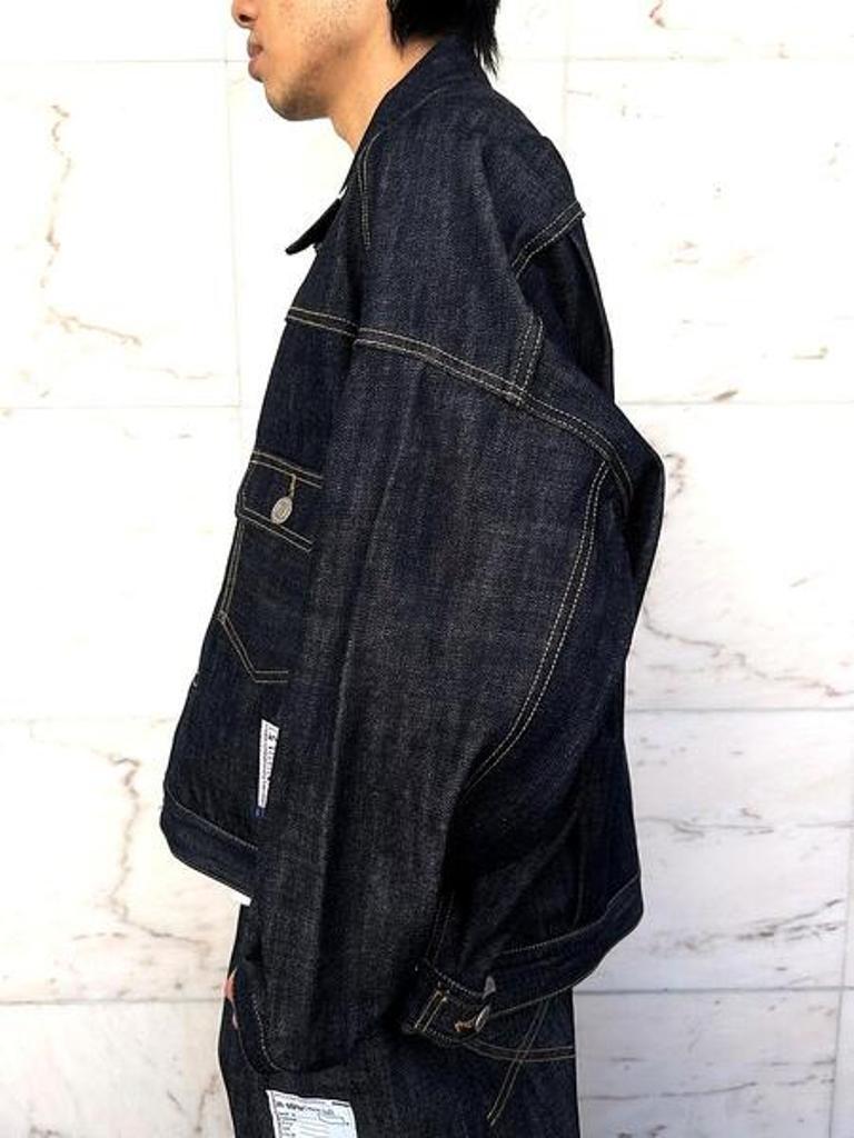 ●リジット(ノンウォッシュ)のセルビッジデニム(耳付き)を使用した、ストレスフリーな”Tバック”タイプのデニムジャケット。ボタンアップ。胸、サイドポケット。