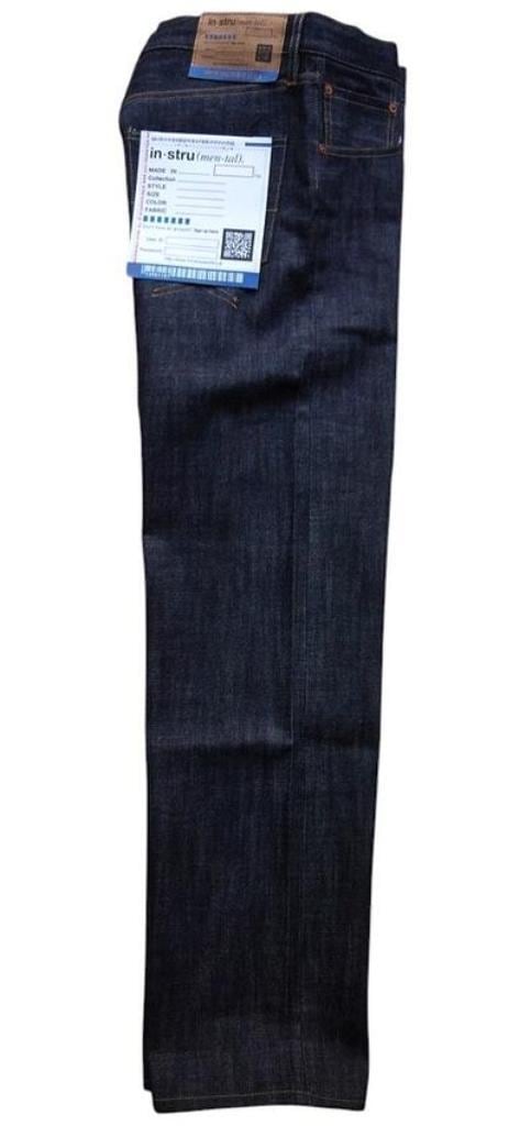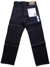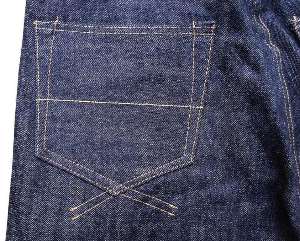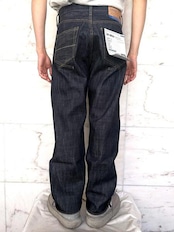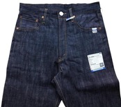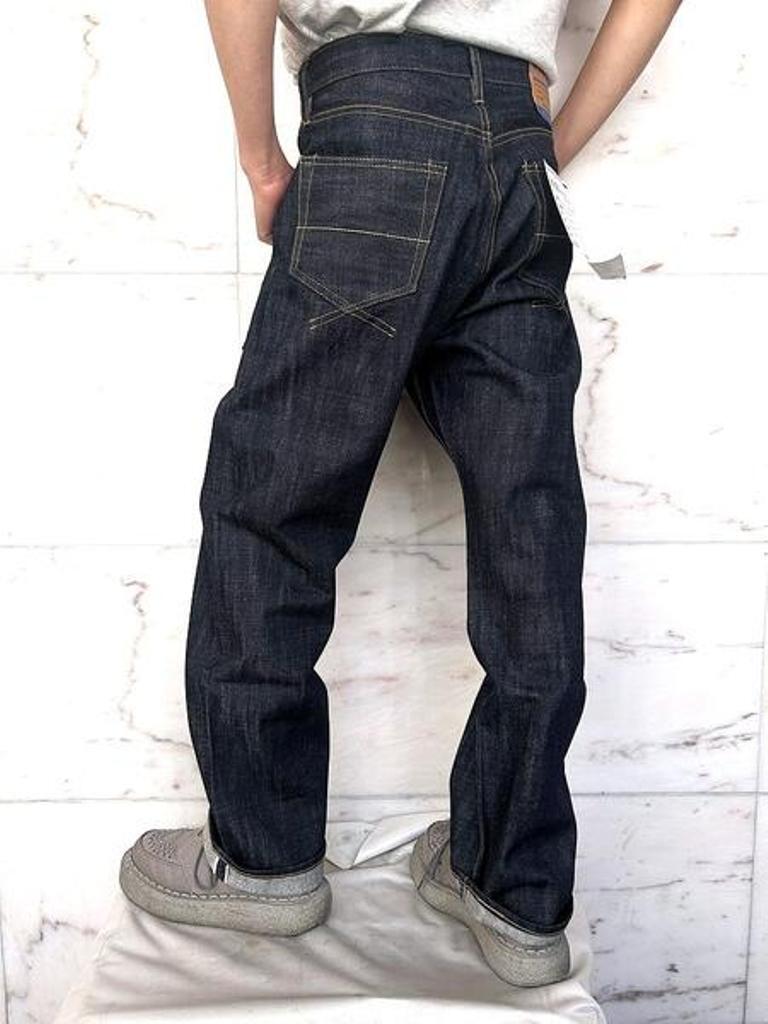●リジット(ノンウォッシュ 未加工)のセルビッジデニム(耳付き)使用のウエストスピンドル入りのレギュラーストレートジーンズ。ストレートシルエット。サイド、 バックポケット。ウエストスピンドル入り、ジップフロント、ボタン仕様。