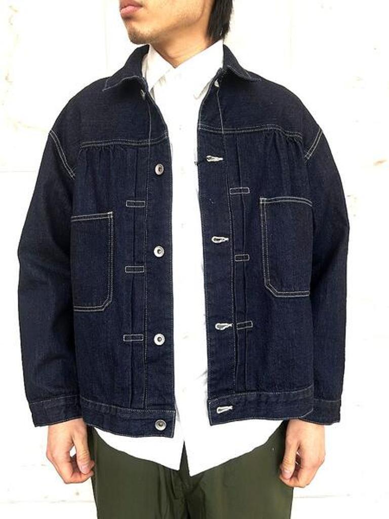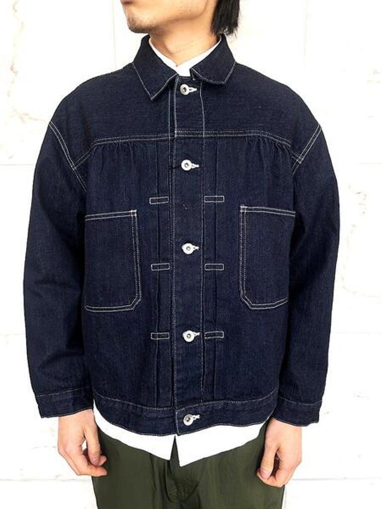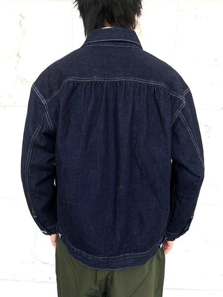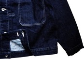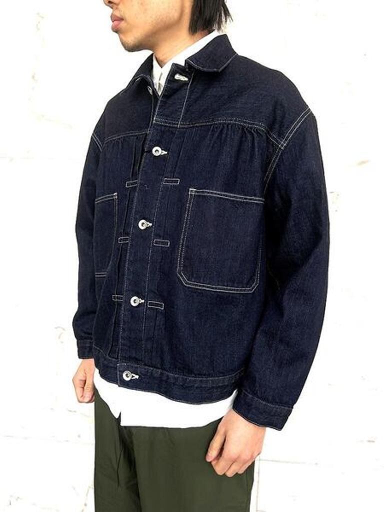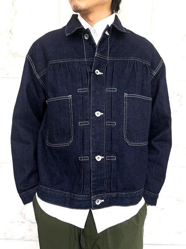 トレンドのデニム生地使用の”スタインベック デニム ジャケット”のカラーダークネイビー(ワンウォッシュ)バージョン。軽やかな着心地とは裏腹にヴィンテージさながらの味わいを楽しんでいただけます。12オンスとは思えない重厚感あるオリジナルデニムは、ショートピッチのスラブ糸(太さに強弱のある糸)をタテ糸にランダムに使用して織り上げました。デニムジャケット・ラブ!!トレンドの"DENIM JACKET"。ただのDENIM JACKETと侮るなかれ!!