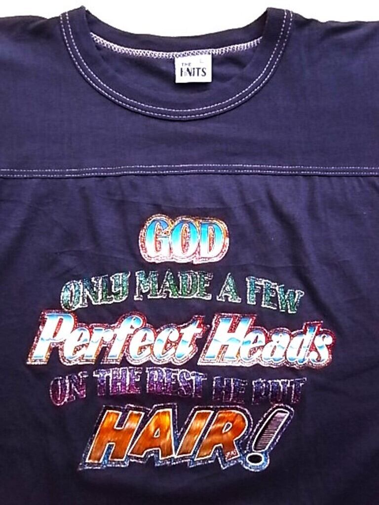 ●フットボールヴィンテージティーシャツ(70’s~80’s)をゲット!!"GOD ONLY MADE A FEW Perfect Heads ON THE REST HE PUT HAIR!"、直訳で「“神様はほんの僅かだけ完璧な頭を作り、他の頭には髪を生やす”ハゲの方が神の作った完璧なもので髪のある方が劣ったもの」というジョークをラメシートプリントで。「デットストック?!」というくらい程度は抜群。この年代のVINTAGEフットボールティーでラメプリントモノでこのサイズは今後出てこないと思います。大推薦!!