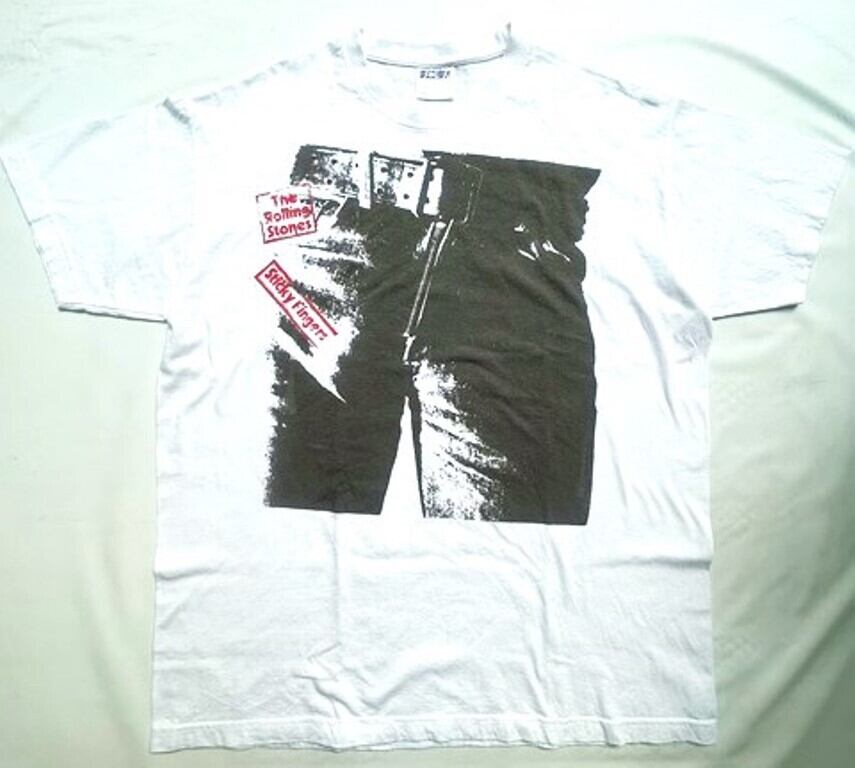 ”The Rolling Stones(ローリング・ストーンズ)”が1971年に発売した、”アンディ・ウォーホル”がアートワークを手掛け、本物のジッパーが付いた傑作アルバム”Sticky Fingers(スティッキー・フィンガーズ)”のプリントティーシャツ。ローリング・ストーンズのシンボルマークの”Lips and Tongue(ベロマーク)”に匹敵するくらいウォホールデザインのこちらのモッコリ”股間”も有名です!!