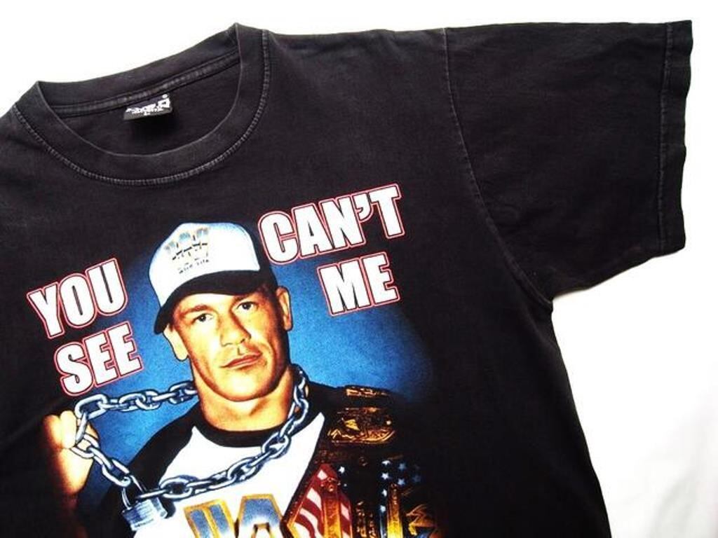 ●世界最大のプロレスリング団体”WWE”所属のスーパースター”JOHN CENA(ジョン・シナ)"ティー。US王座のベルトを持ってるので2004~5年辺りのティーシャツでしょうか?!フロントカラープリント、バックモノクロプリント、フィニッシュ技の”ファイブ・ナックル・シャッフル”を繰り出す前のキメ文句”YOU CAN’T SEE ME(見えっこねぇ)”が◎!!