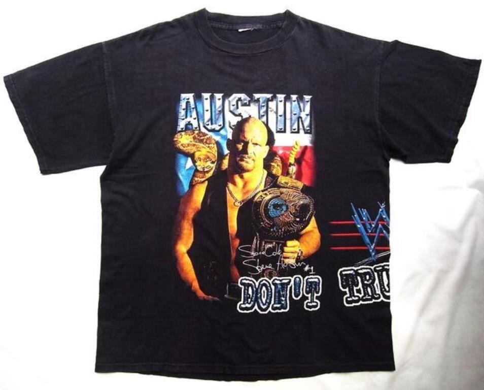 ●世界最大のプロレスリング団体”WWE”所属のスーパースター”STONE COLD”STEVE AUSTIN”(ストーン・コールド・スティーブ・オースチン)"のヴィンテージティー。WWF時代の1998年モノ。フロント、左サイドからバックにかけてキメセリフの一つ”DON’T TRUST ANYBODY!(誰も信用するな)”がCOOL!!タグ欠損しておりますが、大き目なサイズ感(XL)。WWE史上、一番人気の”STONE COLD”STEVE AUSTIN”のヴィンテージティー、今後入手困難になる可能性”大”ですよ。