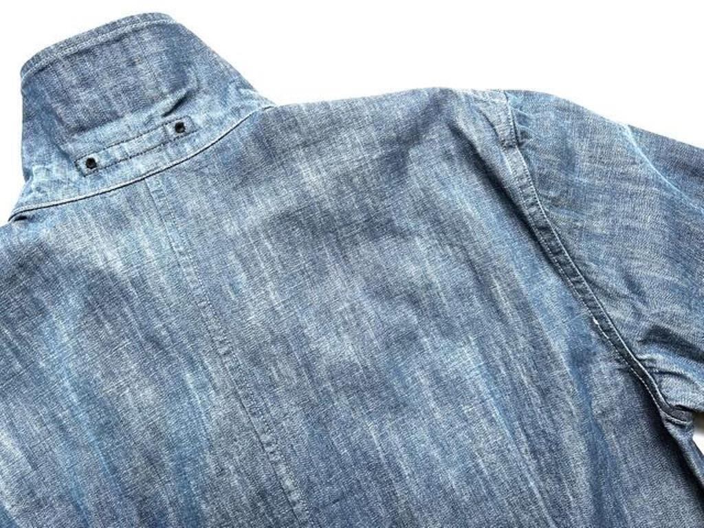 ●”STONE ISLAND(ストーンアイランド)"よりデニムに特化したしたラインとして展開していた”Denims(デニムス)”よりY2K頃にリリースしたライトオンスデニム使いのデニムミリタリーモチーフジャケット。お得意のヴィンテージのサープラス(ミリタリー)ジャケットをサンプリング。微妙にトーンを変えた衿や随所に見られる細かい仕様(ギミック)がポール・ハーベイ(現C.P.COMPANY・Ten Cのデザイナー)期ならでは!今現在でも古臭さを感じさせないトレンドのデニムジャケットです。