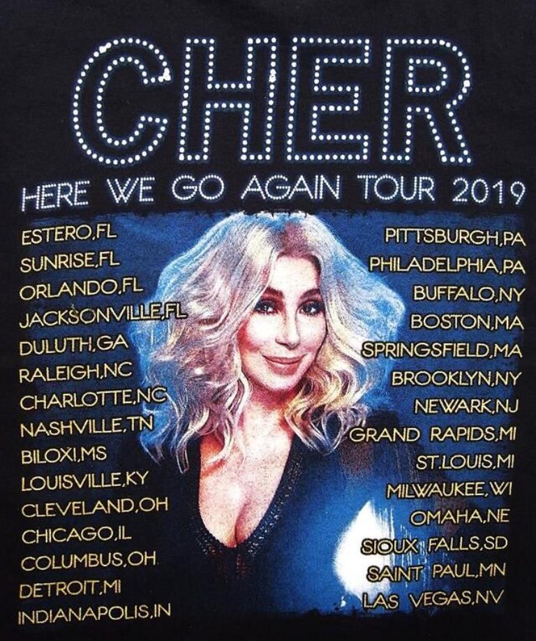 ●アメリカポップス界の大御所”シェール(Cher)の”HERE WE GO AGAIN TOUR 2019”ティーシャツ。63年から活動しているシェール。1979年のヒット曲”Take Me Home”は今だ朝方にプレイされる”NYC”クラブシーンのアンセムソング(そろそろ帰ろう(終わろう)って事です)。グラミー賞最優秀ダンス・レコーディング賞を受賞した1999年リリースの"Believe"もハードハウスシーンで大ヒットでしたね~!!NYCナイトクラブ(HOUSE・DISCO)シーンで育った(遊んでた)ベテランなクラバーにお勧めです!!