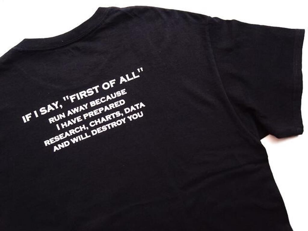 ●”VINTAGE TEE”ブームの火付け役となった”METALLICA(メタリカ)”のワールドツアーティ。お馴染みのメタリカロゴの下に”01.28.2019”。この日付を調べてみたら、ノースカロライナ州ローリーという都市でメタリカ、ライブを開催しておりました。バックの”IF I SAY,”FIRST OF ALL”RUN AWAY BECAUSE I HAVE PREPARED RESEARCH,CHARTS,DATE AND WILL DESTROY YOU”も◎!!。