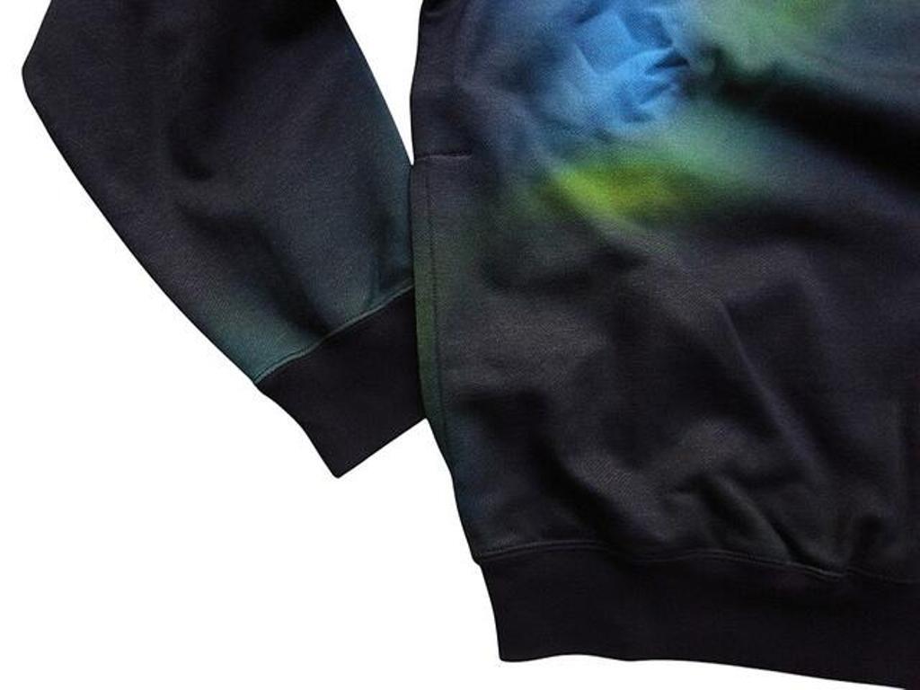 ■ミニマルな佇まいを引き立てるブラックボディーにグリーン・ブルー・イエロー等をグラデーションカラーでランダムにプリント。ランウェイショーでひと際目を引いたオールオーバープリントシリーズの”M AOP HOODIE(メンズ オールオーバープリント フーディー)”。リラックスフィットのオーバーフィッテングスウェットパーカー。